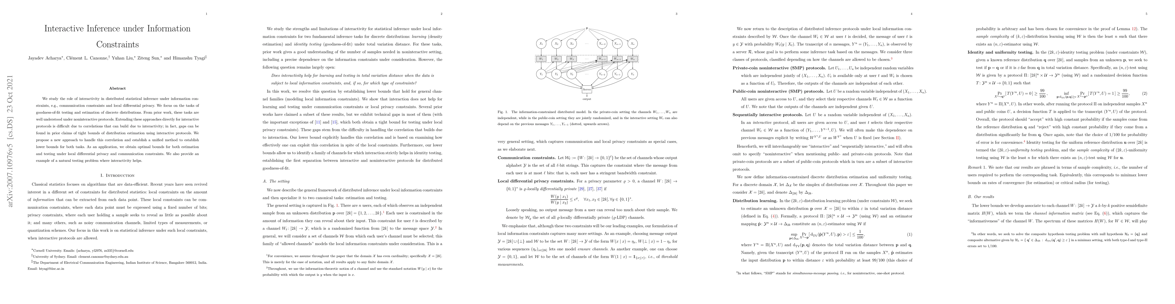 This paper investigates the impact of interactivity on distributed statistical inference under information constraints, addressing challenges in goodness-of-fit testing and discrete distribution estimation. It proposes a novel method to manage correlations arising from interactivity, establishing unified lower bounds and optimal bounds for these tasks under local differential privacy and communication constraints.