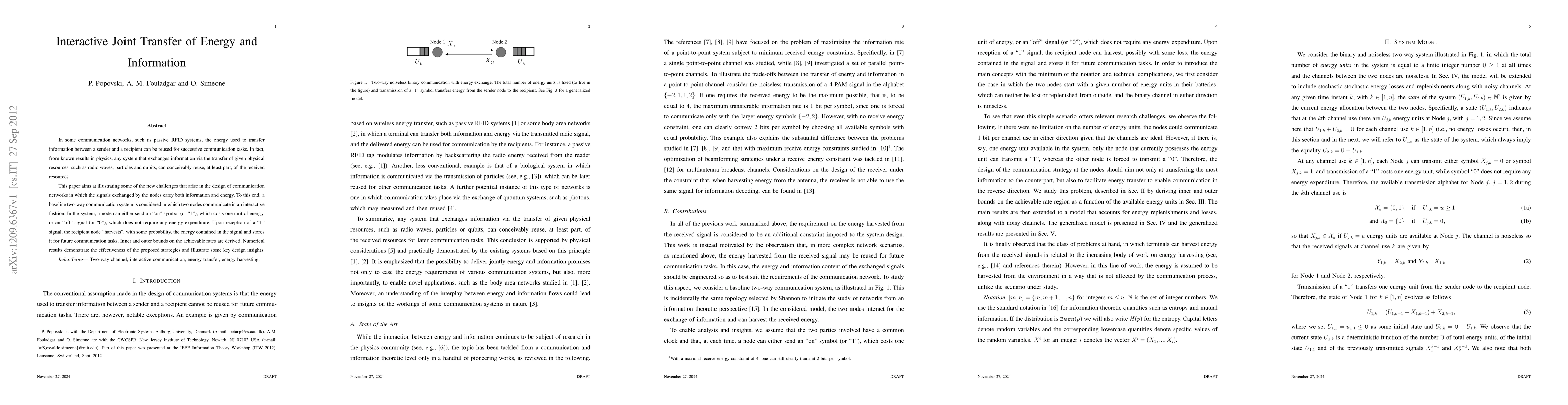 In some communication networks, such as passive RFID systems, the energy used to transfer information between a sender and a recipient can be reused for successive communication tasks. In fact, from known results in physics, any system that exchanges information via the transfer of given physical resources, such as radio waves, particles and qubits, can conceivably reuse, at least part, of the received resources. This paper aims at illustrating some of the new challenges that arise in the design of communication networks in which the signals exchanged by the nodes carry both information and energy. To this end, a baseline two-way communication system is considered in which two nodes communicate in an interactive fashion. In the system, a node can either send an "on" symbol (or "1"), which costs one unit of energy, or an "off" signal (or "0"), which does not require any energy expenditure. Upon reception of a "1" signal, the recipient node "harvests", with some probability, the energy contained in the signal and stores it for future communication tasks. Inner and outer bounds on the achievable rates are derived. Numerical results demonstrate the effectiveness of the proposed strategies and illustrate some key design insights.