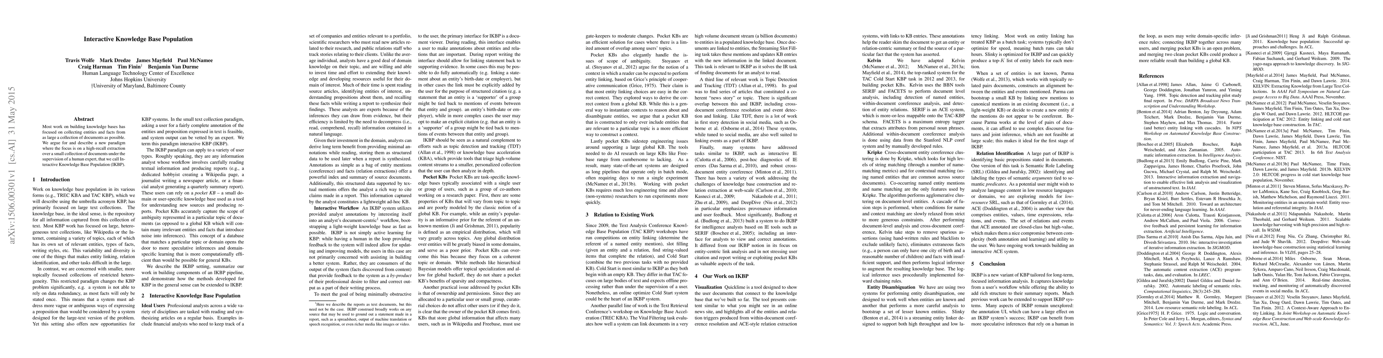 Researchers propose a new approach to building knowledge bases that prioritizes high-quality extraction from small collections of documents under human supervision. This method, called Interactive Knowledge Base Population (IKBP), aims to improve recall over traditional methods focusing on large document collections.