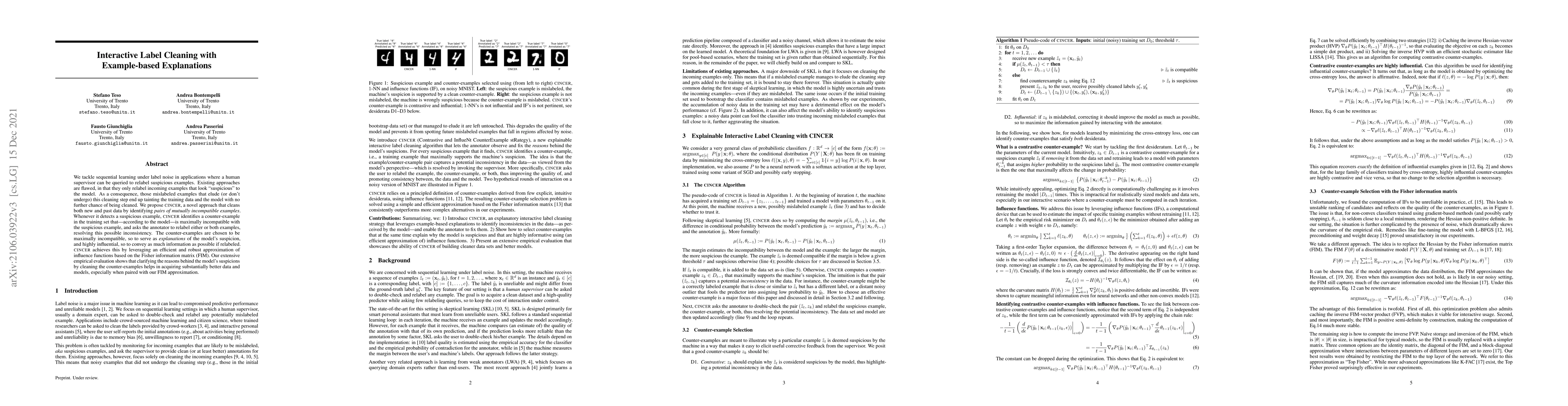 We tackle sequential learning under label noise in applications where a human supervisor can be queried to relabel suspicious examples. Existing approaches are flawed, in that they only relabel incoming examples that look "suspicious" to the model. As a consequence, those mislabeled examples that elude (or don't undergo) this cleaning step end up tainting the training data and the model with no further chance of being cleaned. We propose Cincer, a novel approach that cleans both new and past data by identifying pairs of mutually incompatible examples. Whenever it detects a suspicious example, Cincer identifies a counter-example in the training set that -- according to the model -- is maximally incompatible with the suspicious example, and asks the annotator to relabel either or both examples, resolving this possible inconsistency. The counter-examples are chosen to be maximally incompatible, so to serve as explanations of the model's suspicion, and highly influential, so to convey as much information as possible if relabeled. Cincer achieves this by leveraging an efficient and robust approximation of influence functions based on the Fisher information matrix (FIM). Our extensive empirical evaluation shows that clarifying the reasons behind the model's suspicions by cleaning the counter-examples helps in acquiring substantially better data and models, especially when paired with our FIM approximation.