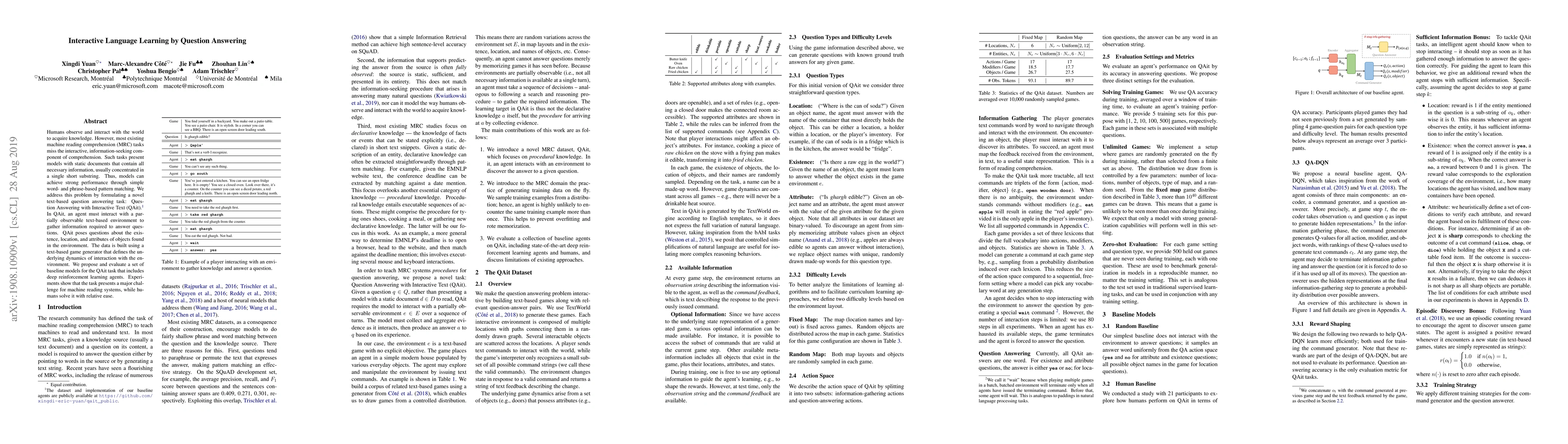 Humans observe and interact with the world to acquire knowledge. However, most existing machine reading comprehension (MRC) tasks miss the interactive, information-seeking component of comprehension. Such tasks present models with static documents that contain all necessary information, usually concentrated in a single short substring. Thus, models can achieve strong performance through simple word- and phrase-based pattern matching. We address this problem by formulating a novel text-based question answering task: Question Answering with Interactive Text (QAit). In QAit, an agent must interact with a partially observable text-based environment to gather information required to answer questions. QAit poses questions about the existence, location, and attributes of objects found in the environment. The data is built using a text-based game generator that defines the underlying dynamics of interaction with the environment. We propose and evaluate a set of baseline models for the QAit task that includes deep reinforcement learning agents. Experiments show that the task presents a major challenge for machine reading systems, while humans solve it with relative ease.