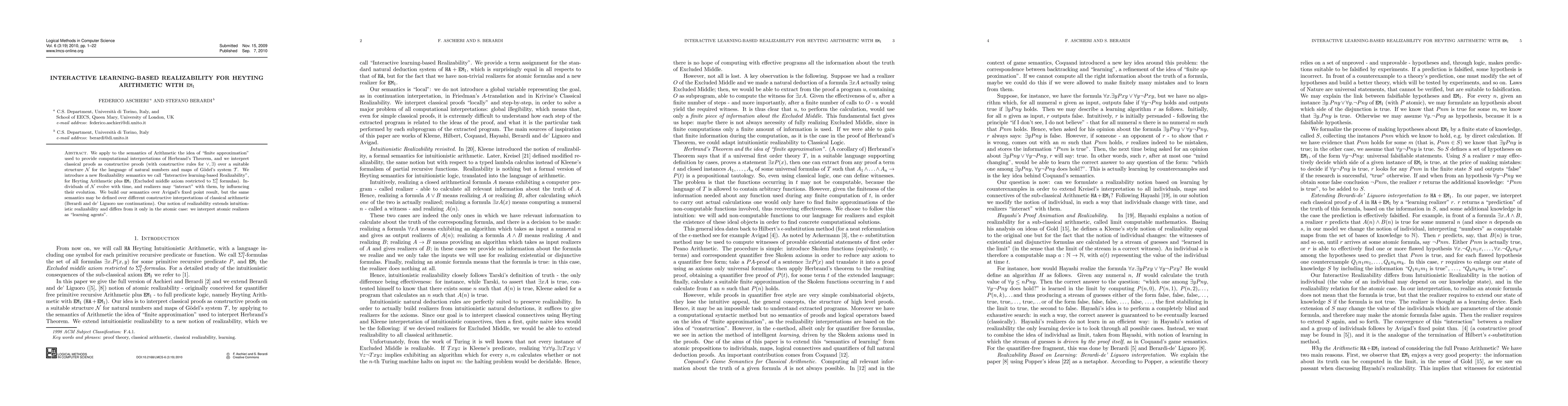 This paper introduces an "Interactive learning-based Realizability" semantics for Heyting Arithmetic with $\EM_1$, using finite approximation and evolving individuals to interpret classical proofs constructively. It extends intuitionistic realizability, interpreting atomic realizers as "learning agents" that can influence the evolving structure.