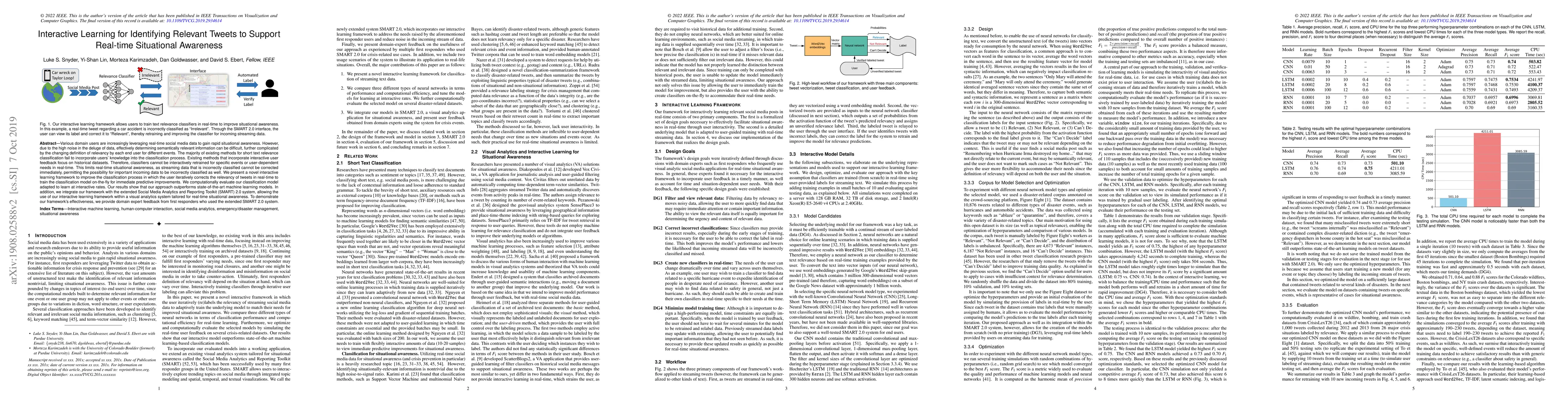 This paper introduces an interactive learning framework for real-time classification of relevant tweets to enhance situational awareness, allowing users to correct tweet relevancy on-the-fly. The proposed method outperforms existing models and is integrated with the SMART 2.0 system for visual analytics, demonstrating effectiveness through feedback from first responders.