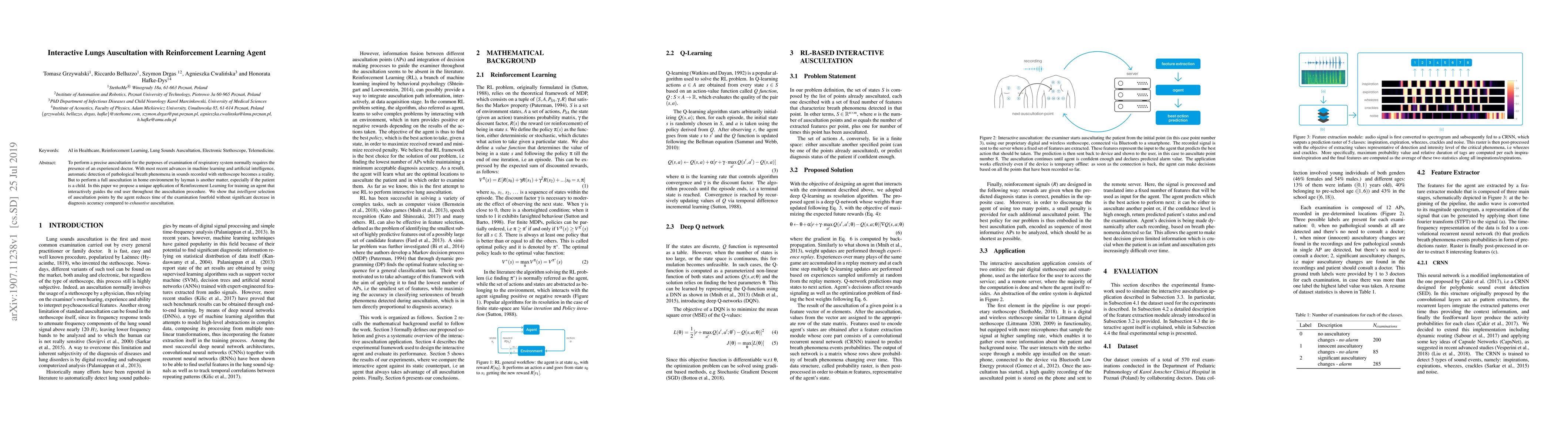 To perform a precise auscultation for the purposes of examination of respiratory system normally requires the presence of an experienced doctor. With most recent advances in machine learning and artificial intelligence, automatic detection of pathological breath phenomena in sounds recorded with stethoscope becomes a reality. But to perform a full auscultation in home environment by layman is another matter, especially if the patient is a child. In this paper we propose a unique application of Reinforcement Learning for training an agent that interactively guides the end user throughout the auscultation procedure. We show that \textit{intelligent} selection of auscultation points by the agent reduces time of the examination fourfold without significant decrease in diagnosis accuracy compared to exhaustive auscultation.