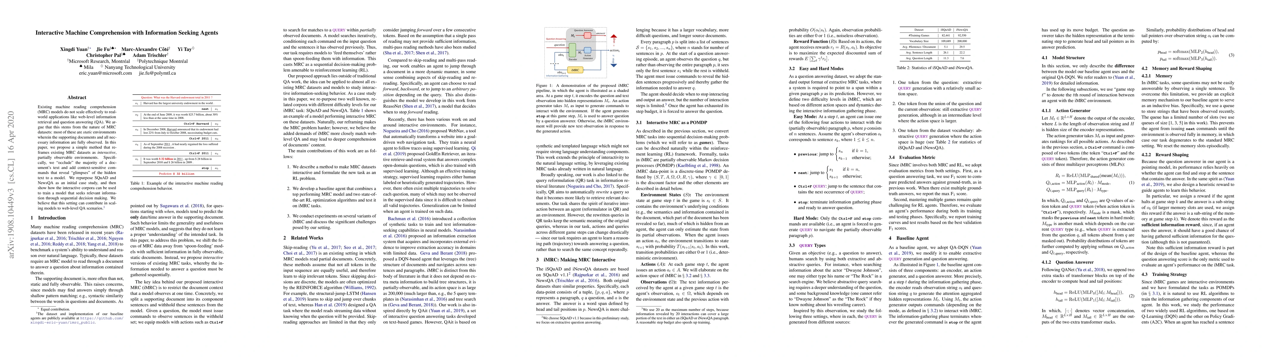 This paper proposes an interactive machine reading comprehension method by transforming existing MRC datasets into partially observable environments, where models must sequentially request glimpses of hidden text to answer questions. This approach aims to better scale MRC models for real-world web-level information retrieval and question answering.