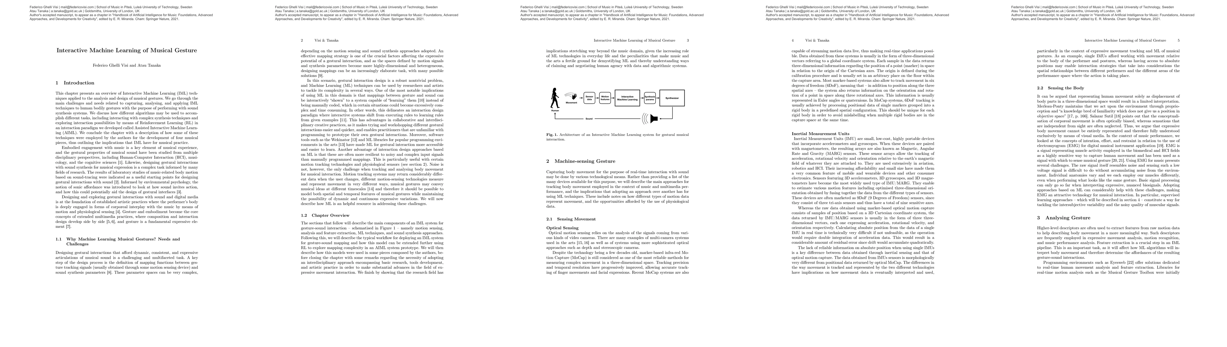 This chapter presents an overview of Interactive Machine Learning (IML) techniques applied to the analysis and design of musical gestures. We go through the main challenges and needs related to capturing, analysing, and applying IML techniques to human bodily gestures with the purpose of performing with sound synthesis systems. We discuss how different algorithms may be used to accomplish different tasks, including interacting with complex synthesis techniques and exploring interaction possibilities by means of Reinforcement Learning (RL) in an interaction paradigm we developed called Assisted Interactive Machine Learning (AIML). We conclude the chapter with a description of how some of these techniques were employed by the authors for the development of four musical pieces, thus outlining the implications that IML have for musical practice.