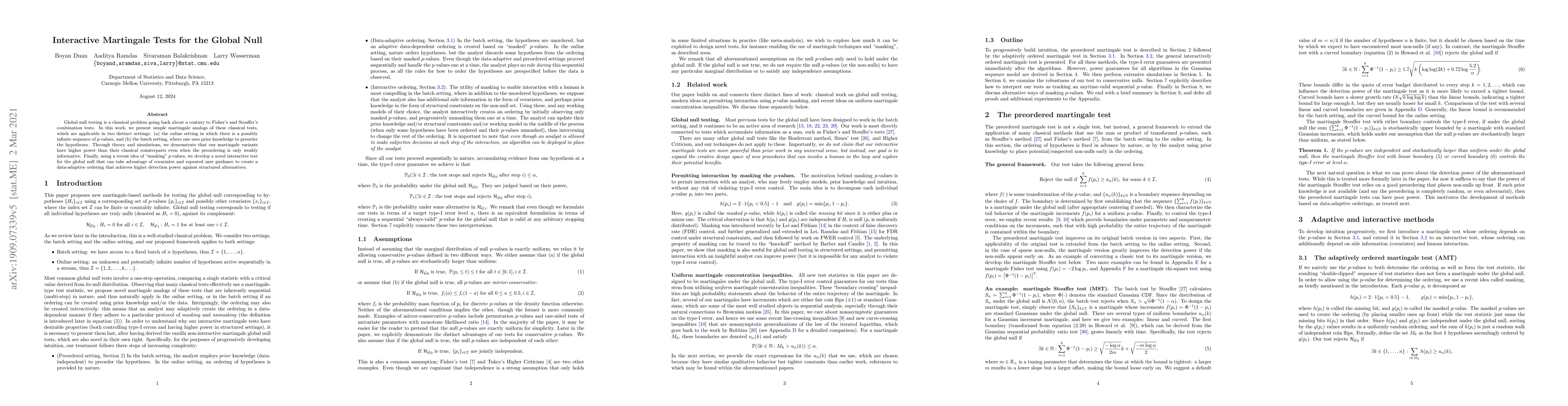 Global null testing is a classical problem going back about a century to Fisher's and Stouffer's combination tests. In this work, we present simple martingale analogs of these classical tests, which are applicable in two distinct settings: (a) the online setting in which there is a possibly infinite sequence of $p$-values, and (b) the batch setting, where one uses prior knowledge to preorder the hypotheses. Through theory and simulations, we demonstrate that our martingale variants have higher power than their classical counterparts even when the preordering is only weakly informative. Finally, using a recent idea of "masking" $p$-values, we develop a novel interactive test for the global null that can take advantage of covariates and repeated user guidance to create a data-adaptive ordering that achieves higher detection power against structured alternatives.