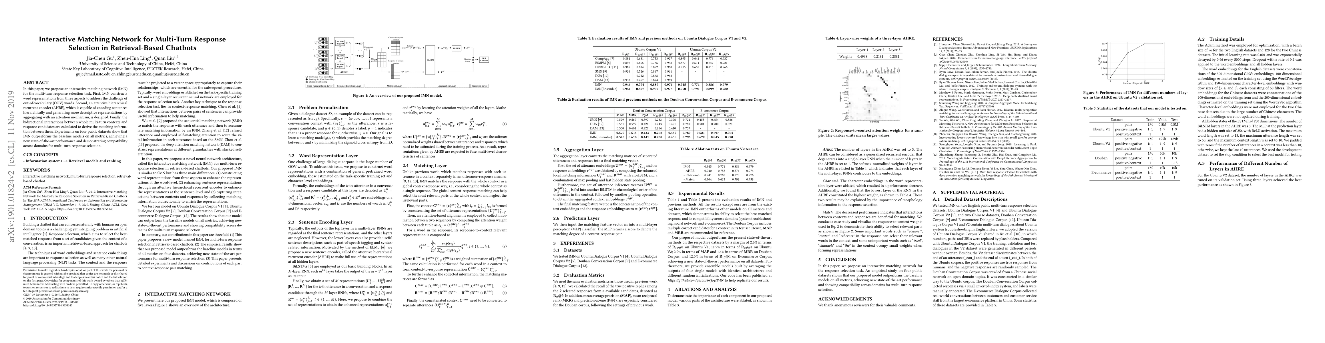 This paper introduces an Interactive Matching Network (IMN) for multi-turn response selection in retrieval-based chatbots, employing word representations from three aspects to handle out-of-vocabulary words and an attentive hierarchical recurrent encoder for enhanced sentence encoding. Experiments demonstrate IMN's superior performance over baseline models across multiple datasets.