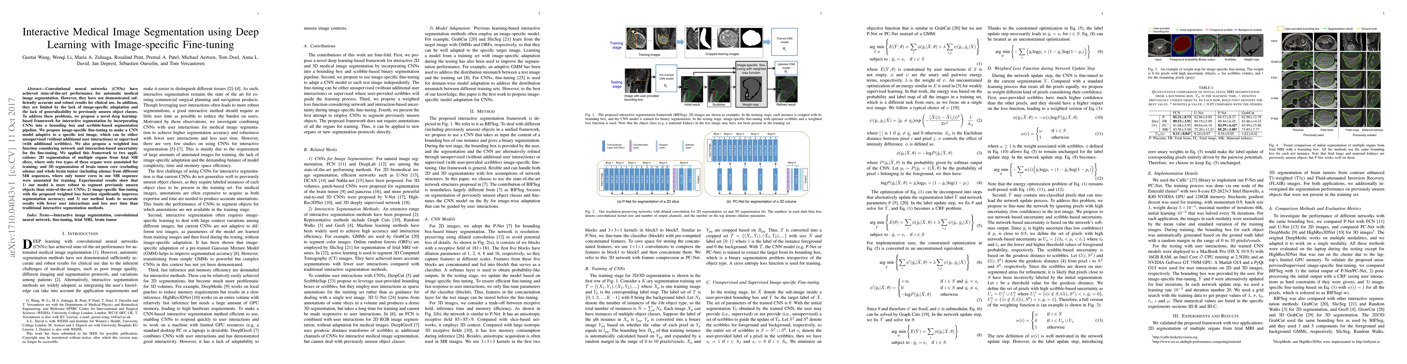 This paper proposes a deep learning framework for interactive medical image segmentation that incorporates CNNs and image-specific fine-tuning to enhance model accuracy and robustness. The method achieves better performance in segmenting previously unseen objects and requires fewer user interactions compared to traditional methods.
