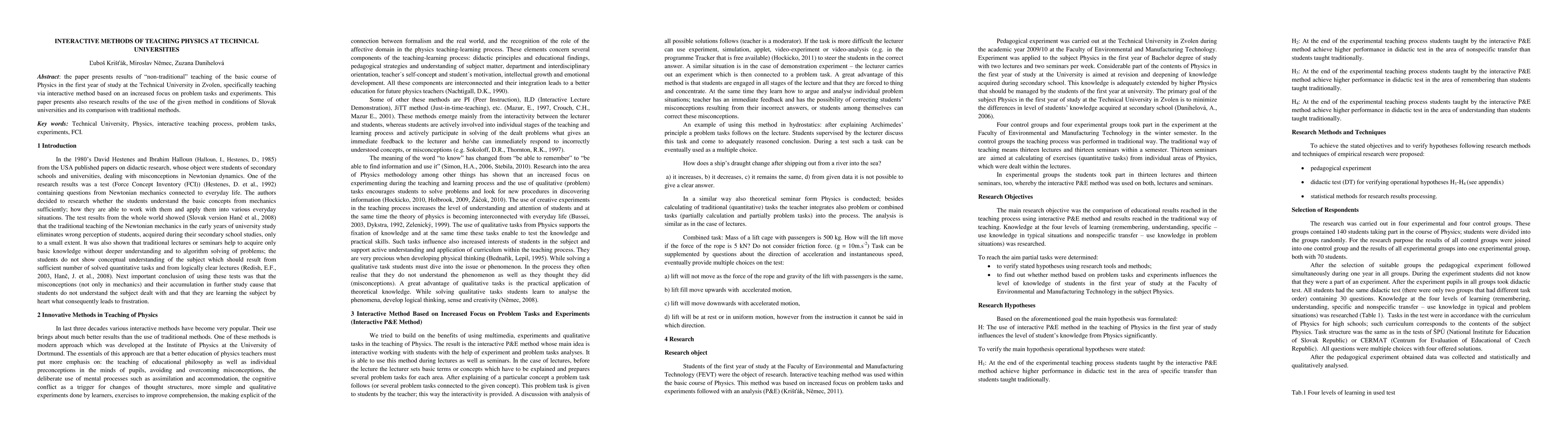 The papeer presents results of "non-traditional" teaching of basic course of Physics in the first year of study at the Technical University in Zvolen, specifically teaching via interactive method based on an increased focus on problem tasks and experiments. This paper presents also research results of the use of the given method in conditions of Slovak universities and its comparision with traditional methods.