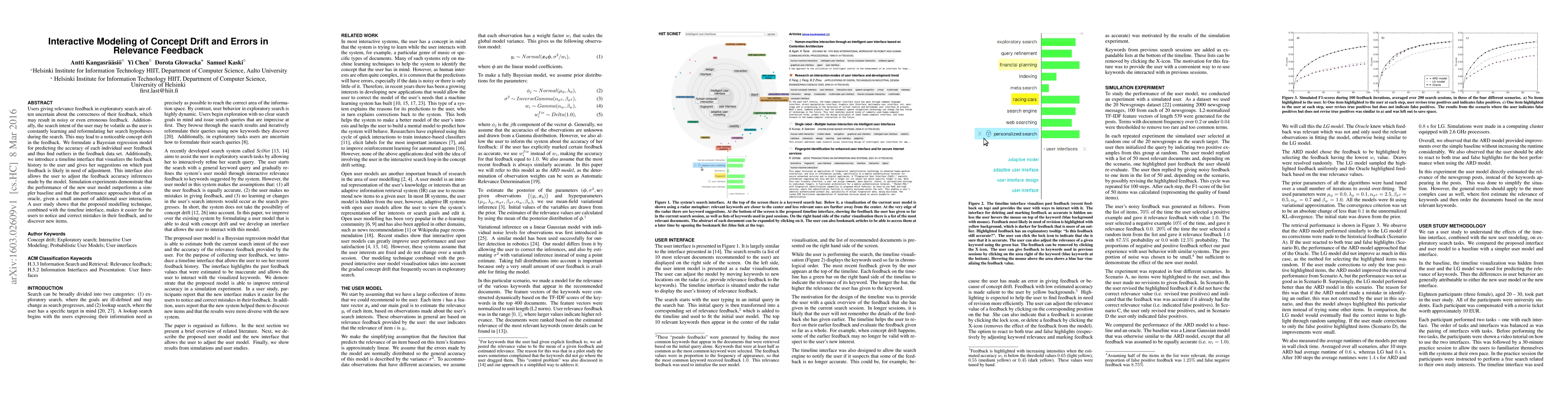 Users giving relevance feedback in exploratory search are often uncertain about the correctness of their feedback, which may result in noisy or even erroneous feedback. Additionally, the search intent of the user may be volatile as the user is constantly learning and reformulating her search hypotheses during the search. This may lead to a noticeable concept drift in the feedback. We formulate a Bayesian regression model for predicting the accuracy of each individual user feedback and thus find outliers in the feedback data set. Additionally, we introduce a timeline interface that visualizes the feedback history to the user and gives her suggestions on which past feedback is likely in need of adjustment. This interface also allows the user to adjust the feedback accuracy inferences made by the model. Simulation experiments demonstrate that the performance of the new user model outperforms a simpler baseline and that the performance approaches that of an oracle, given a small amount of additional user interaction. A user study shows that the proposed modelling technique, combined with the timeline interface, makes it easier for the users to notice and correct mistakes in their feedback, and to discover new items.