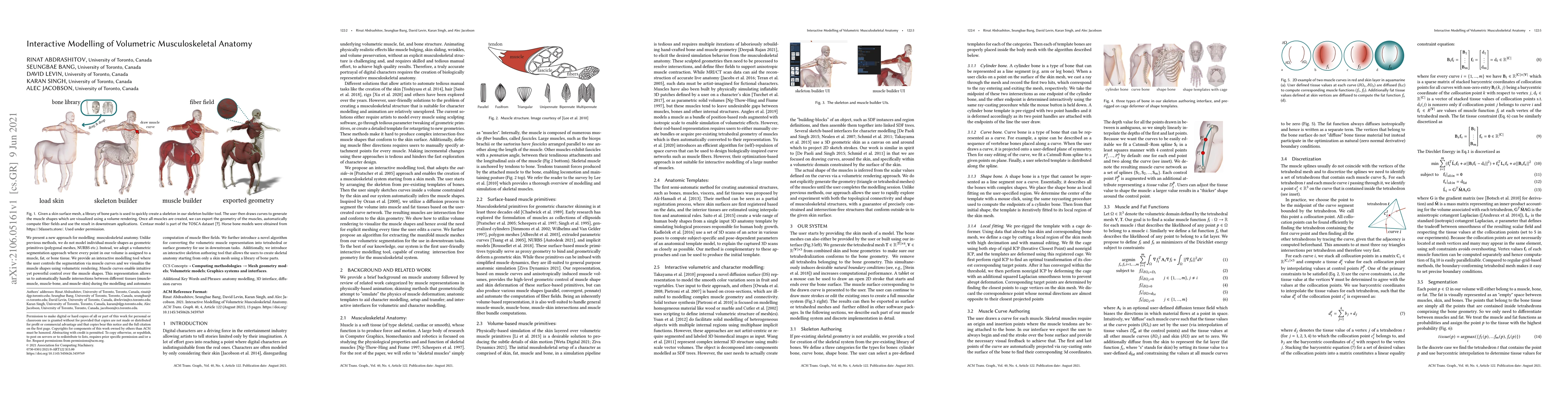 This paper proposes a volumetric segmentation approach for modelling musculoskeletal anatomy, enabling intuitive control through muscle curves and automatic handling of tissue intersections. It also introduces tools for converting volumetric representations into tetrahedral or surface geometries and an interactive skeleton authoring tool.