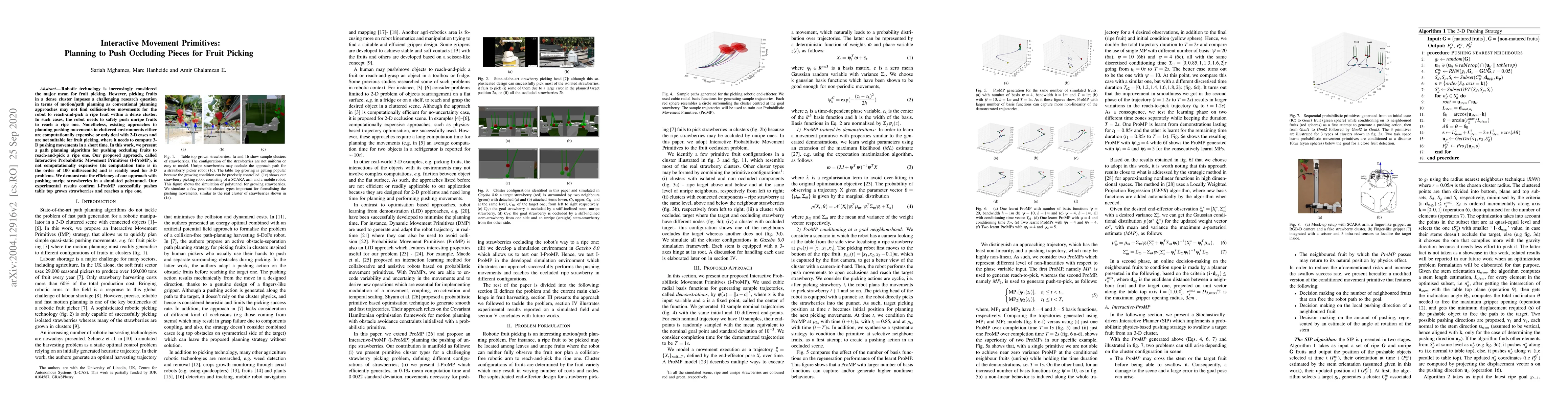 I-ProMP distinguishes itself from existing approaches by being computationally efficient, applicable to 3-D problems, and specifically designed for fruit picking scenarios with occlusions.