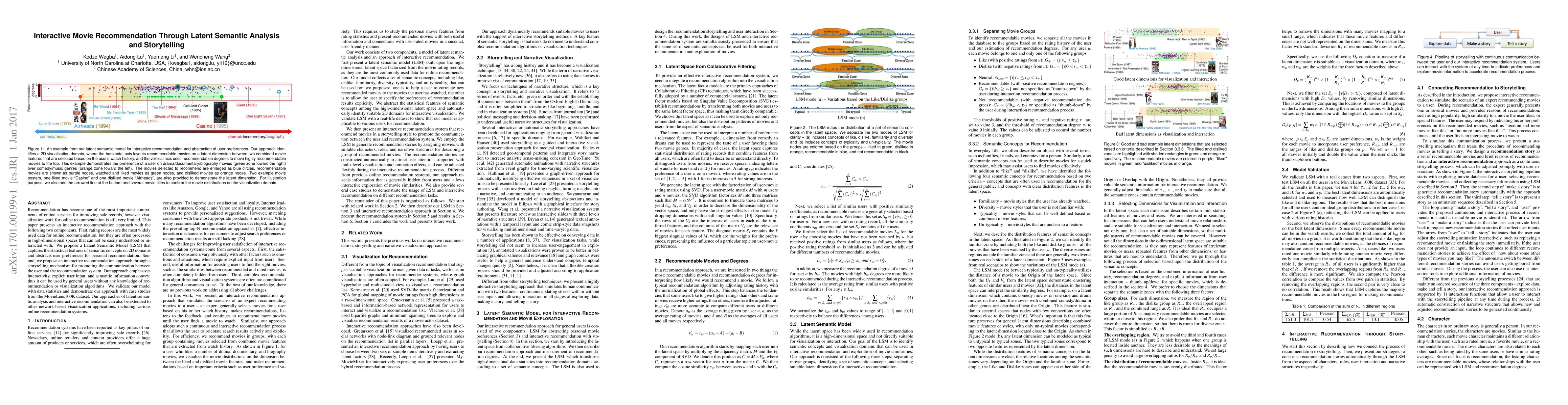Recommendation has become one of the most important components of online services for improving sale records, however visualization work for online recommendation is still very limited. This paper presents an interactive recommendation approach with the following two components. First, rating records are the most widely used data for online recommendation, but they are often processed in high-dimensional spaces that can not be easily understood or interacted with. We propose a Latent Semantic Model (LSM) that captures the statistical features of semantic concepts on 2D domains and abstracts user preferences for personal recommendation. Second, we propose an interactive recommendation approach through a storytelling mechanism for promoting the communication between the user and the recommendation system. Our approach emphasizes interactivity, explicit user input, and semantic information convey; thus it can be used by general users without any knowledge of recommendation or visualization algorithms. We validate our model with data statistics and demonstrate our approach with case studies from the MovieLens100K dataset. Our approaches of latent semantic analysis and interactive recommendation can also be extended to other network-based visualization applications, including various online recommendation systems.