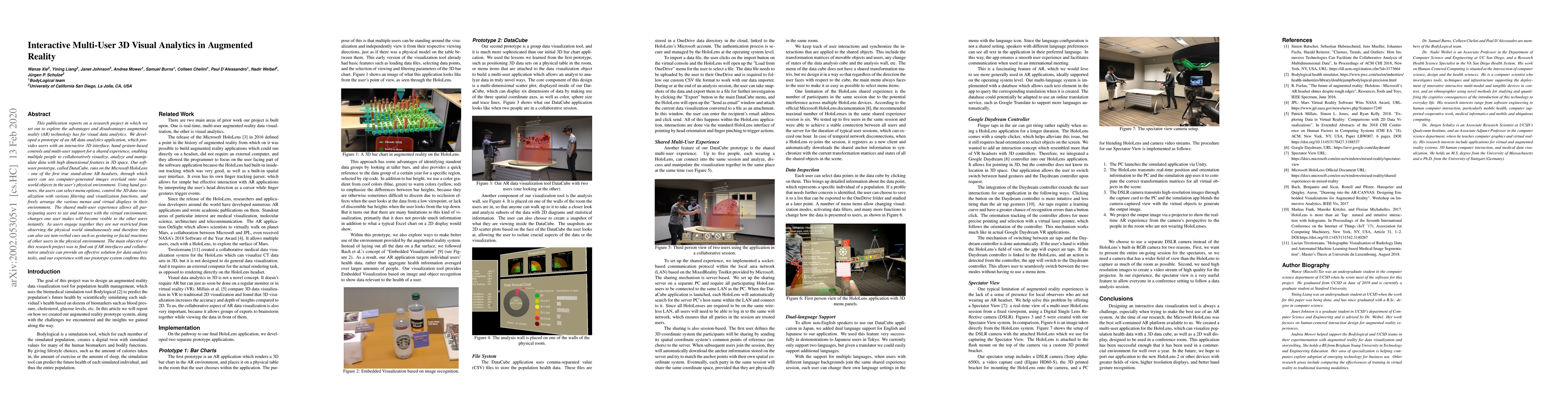This paper explores the potential of augmented reality (AR) for multi-user 3D visual analytics, developing a prototype called DataCube that enables collaborative data analysis through hand gesture controls and shared experiences on Microsoft HoloLens. The study finds that AR interfaces can effectively support collaborative data analysis tasks.