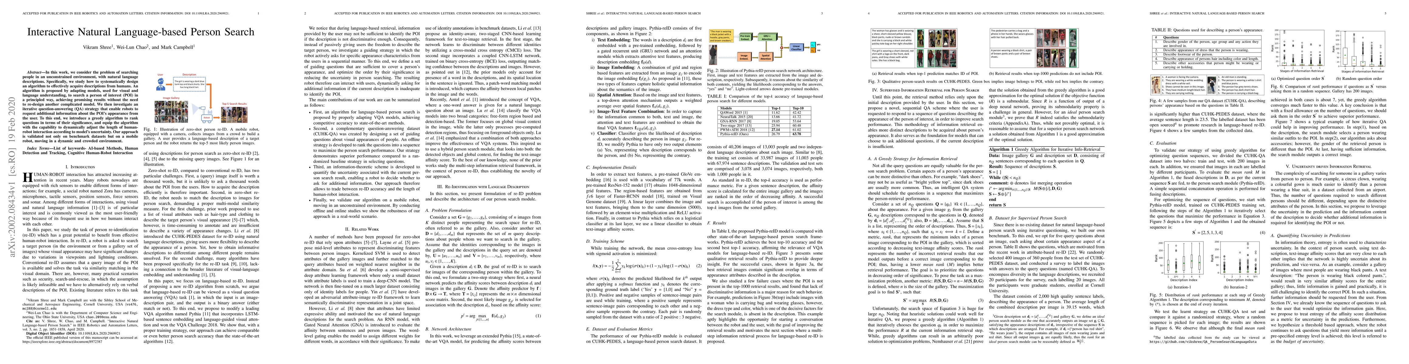 This paper proposes an algorithm for natural language-based person search in unconstrained environments, leveraging visual and language models to identify a person of interest. It introduces an iterative question-answering strategy to dynamically refine search queries based on model uncertainty, validated on both datasets and a mobile robot in dynamic settings.