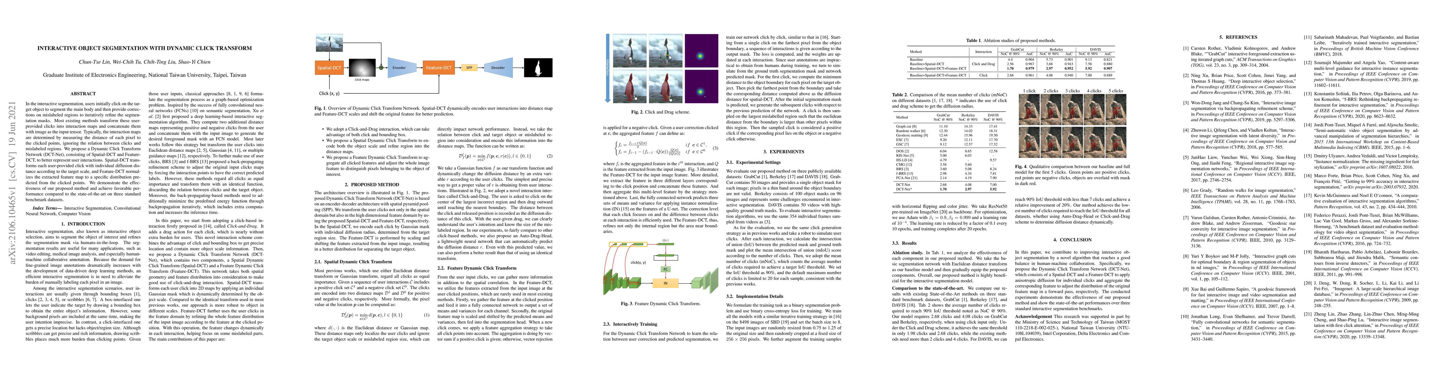 The paper proposes a Dynamic Click Transform Network (DCT-Net) to improve interactive object segmentation by better representing user interactions through Spatial-DCT and Feature-DCT. The method outperforms existing techniques on standard datasets.