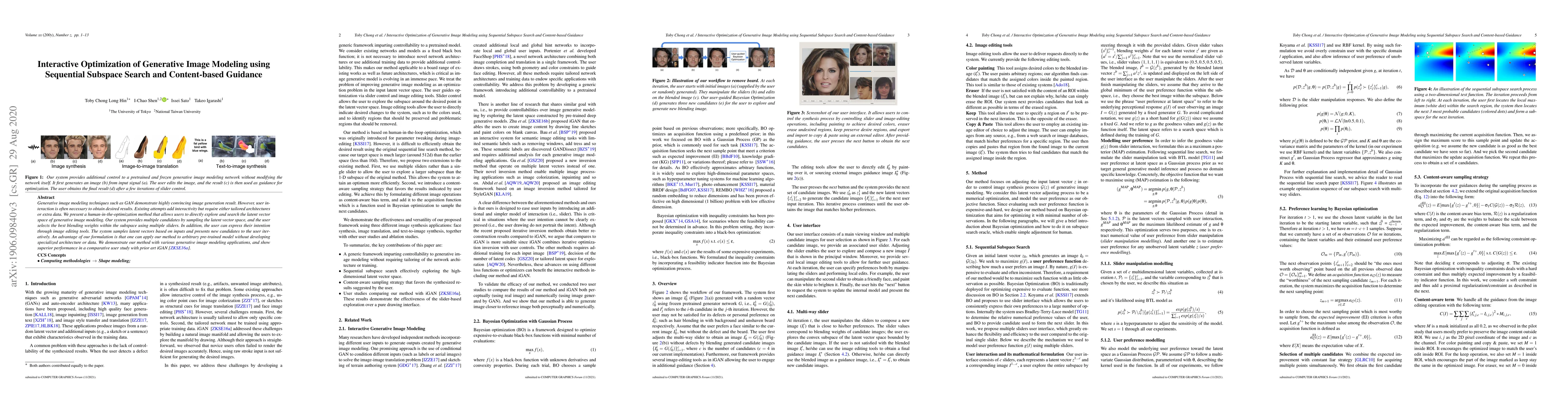 This paper introduces an interactive optimization technique for generative image modeling that leverages sequential subspace search and content-based guidance, enabling users to directly manipulate latent vectors and refine generated images through sliders and editing tools. The method works with any pre-trained model without requiring specialized architecture or data, as demonstrated by superior performance in a comparative user study against iGAN.