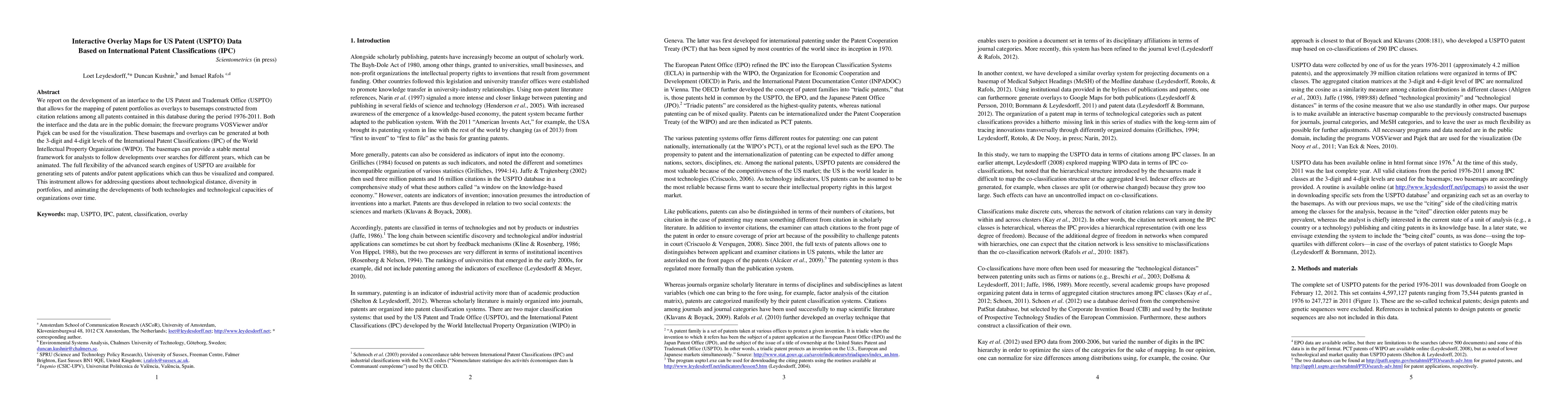 This paper describes an interactive mapping interface for US patent data, visualizing patent portfolios over basemaps based on citation relations, using International Patent Classifications. The tool enables analysis of technological trends and organizational developments over time, utilizing public domain data and visualization software.