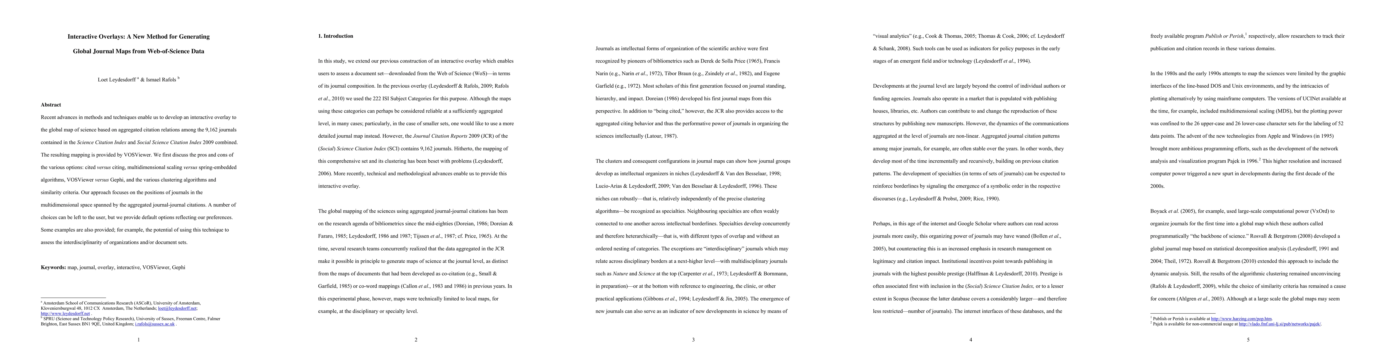 This paper introduces an interactive overlay method for generating global journal maps using Web-of-Science data, employing VOSViewer to visualize aggregated citation relations among 9,162 journals. The study discusses various algorithmic and clustering options, focusing on journal positioning in a multidimensional citation space, and demonstrates potential applications in assessing interdisciplinarity.