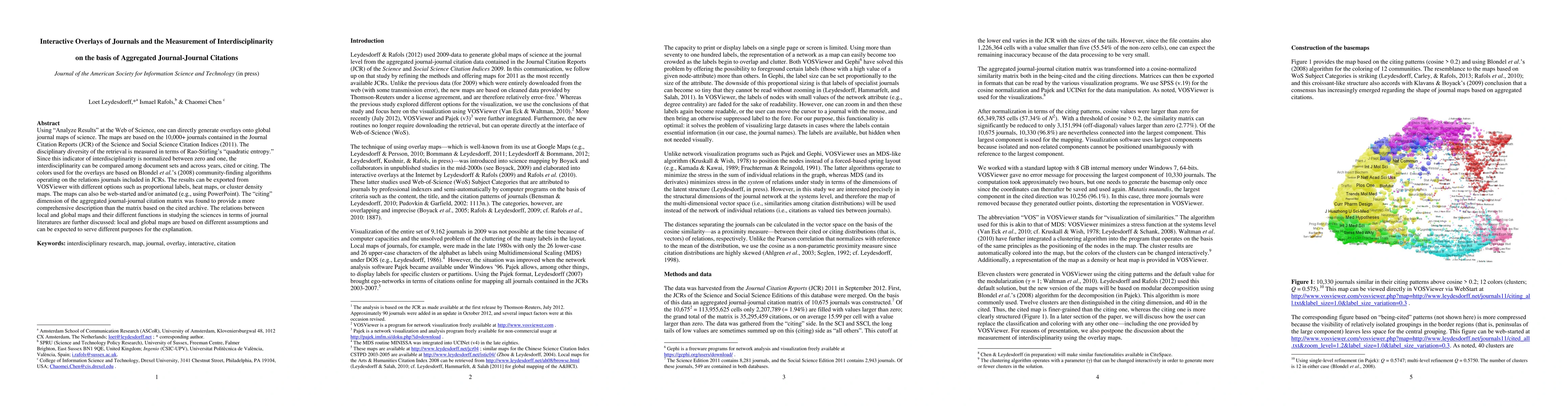 Using "Analyze Results" at the Web of Science, one can directly generate overlays onto global journal maps of science. The maps are based on the 10,000+ journals contained in the Journal Citation Reports (JCR) of the Science and Social Science Citation Indices (2011). The disciplinary diversity of the retrieval is measured in terms of Rao-Stirling's "quadratic entropy." Since this indicator of interdisciplinarity is normalized between zero and one, the interdisciplinarity can be compared among document sets and across years, cited or citing. The colors used for the overlays are based on Blondel et al.'s (2008) community-finding algorithms operating on the relations journals included in JCRs. The results can be exported from VOSViewer with different options such as proportional labels, heat maps, or cluster density maps. The maps can also be web-started and/or animated (e.g., using PowerPoint). The "citing" dimension of the aggregated journal-journal citation matrix was found to provide a more comprehensive description than the matrix based on the cited archive. The relations between local and global maps and their different functions in studying the sciences in terms of journal litteratures are further discussed: local and global maps are based on different assumptions and can be expected to serve different purposes for the explanation.