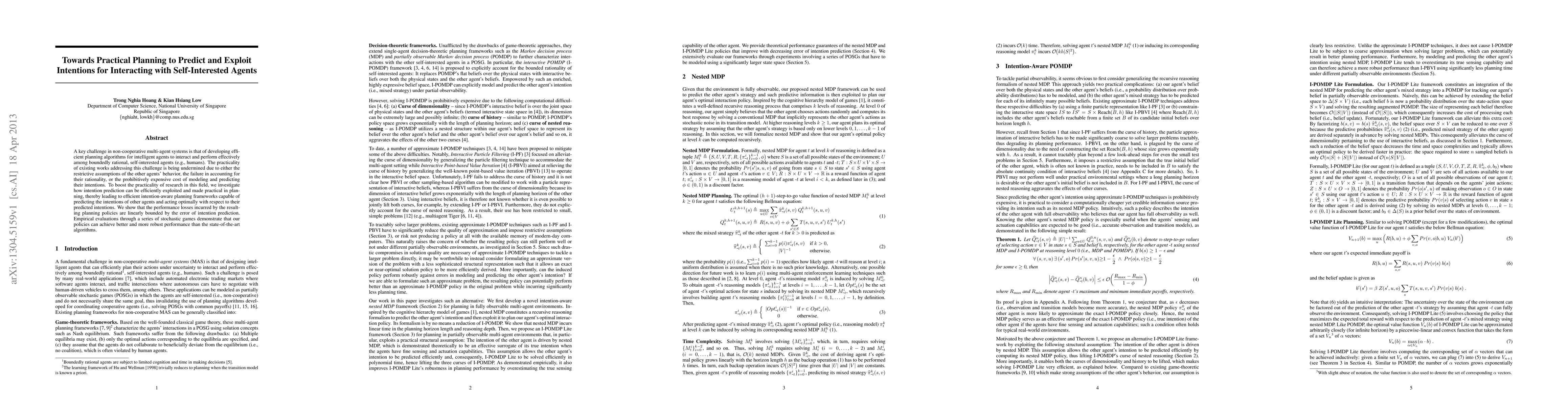 This paper proposes an efficient planning algorithm for interacting with self-interested agents by predicting their intentions using an Interactive POMDP Lite framework. The approach achieves practical performance with bounded errors and outperforms state-of-the-art algorithms in stochastic games.
