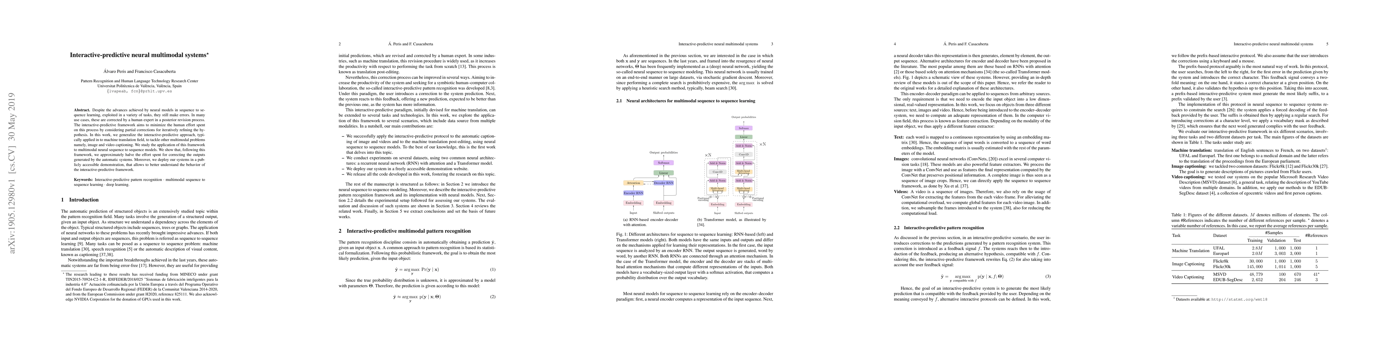 The paper describes the development of interactive-predictive neural multimodal systems for tasks such as machine translation, image, and video captioning. The systems are built using NMT-Keras with RNN-based and Transformer architectures, trained on various datasets and evaluated using BLEU, METEOR, CharacTER, and KSMR metrics.