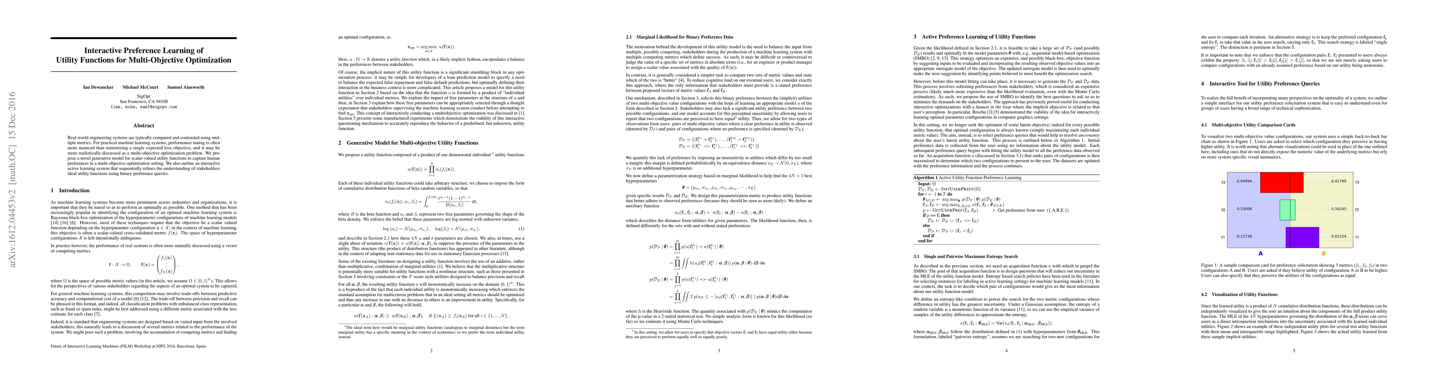 Real-world engineering systems are typically compared and contrasted using multiple metrics. For practical machine learning systems, performance tuning is often more nuanced than minimizing a single expected loss objective, and it may be more realistically discussed as a multi-objective optimization problem. We propose a novel generative model for scalar-valued utility functions to capture human preferences in a multi-objective optimization setting. We also outline an interactive active learning system that sequentially refines the understanding of stakeholders ideal utility functions using binary preference queries.