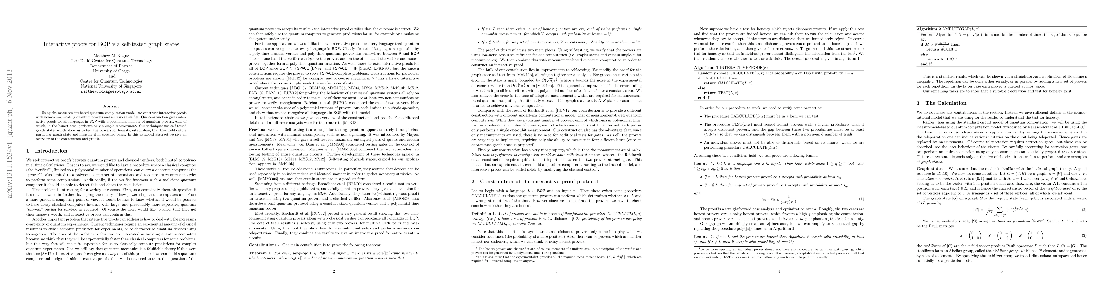 This paper constructs interactive proofs for all languages in BQP using a measurement-based quantum computation model with non-communicating quantum provers and a classical verifier. It employs self-tested graph states to ensure prover honesty through single-measurement verification.