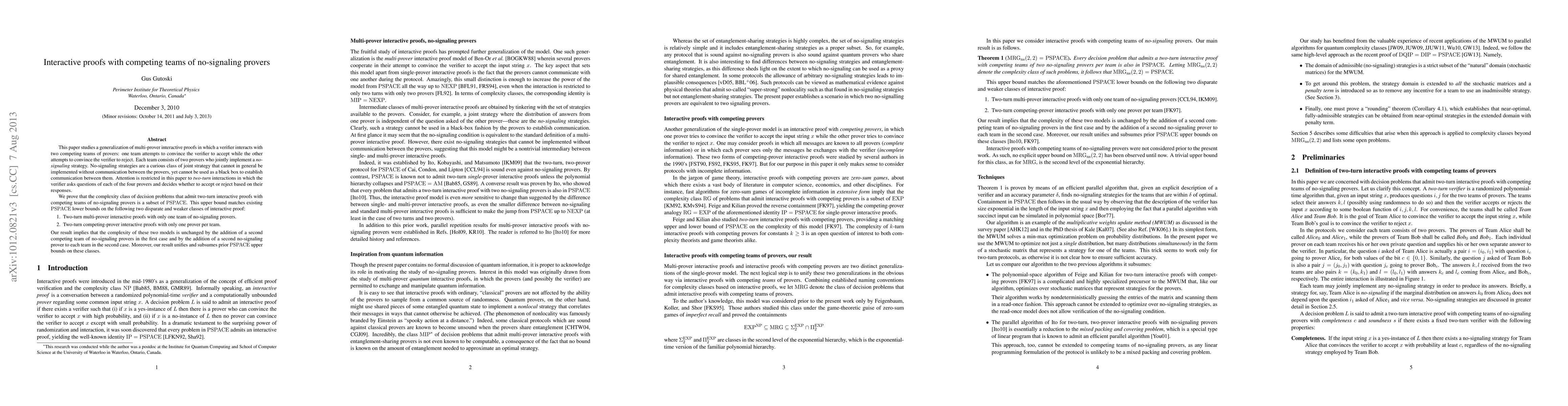 This paper studies a generalization of multi-prover interactive proofs in which a verifier interacts with two competing teams of provers: one team attempts to convince the verifier to accept while the other attempts to convince the verifier to reject. Each team consists of two provers who jointly implement a no-signaling strategy. No-signaling strategies are a curious class of joint strategy that cannot in general be implemented without communication between the provers, yet cannot be used as a black box to establish communication between them. Attention is restricted in this paper to two-turn interactions in which the verifier asks questions of each of the four provers and decides whether to accept or reject based on their responses. We prove that the complexity class of decision problems that admit two-turn interactive proofs with competing teams of no-signaling provers is a subset of PSPACE. This upper bound matches existing PSPACE lower bounds on the following two disparate and weaker classes of interactive proof: 1. Two-turn multi-prover interactive proofs with only one team of no-signaling provers. 2. Two-turn competing-prover interactive proofs with only one prover per team. Our result implies that the complexity of these two models is unchanged by the addition of a second competing team of no-signaling provers in the first case and by the addition of a second no-signaling prover to each team in the second case. Moreover, our result unifies and subsumes prior PSPACE upper bounds on these classes.