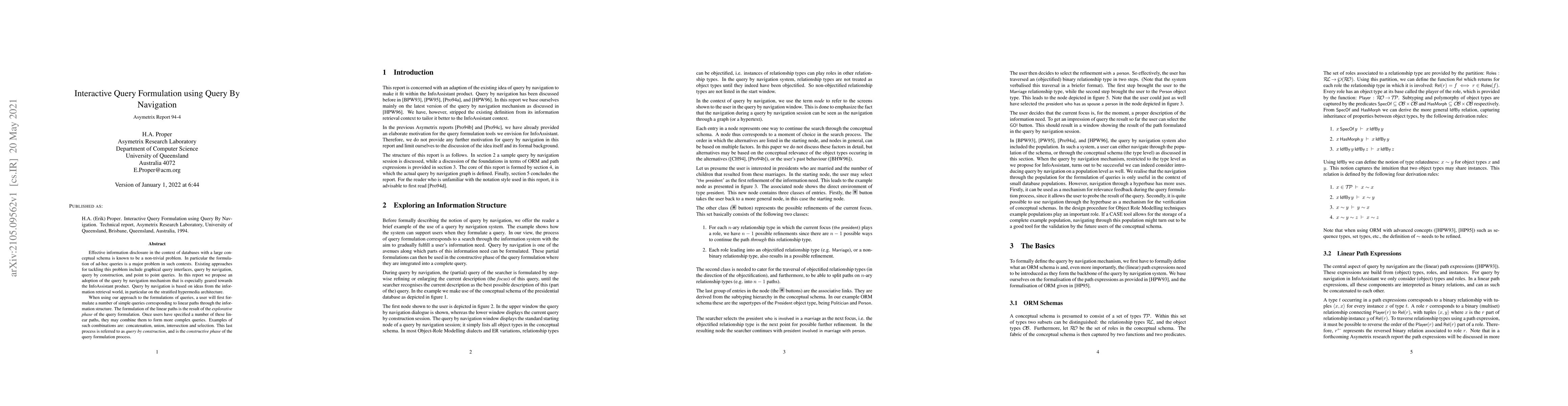 This paper proposes an interactive query formulation method using query by navigation, tailored for the InfoAssistant product. Users first explore the database structure through simple linear paths, then combine these paths to create more complex queries via concatenation, union, intersection, and selection.