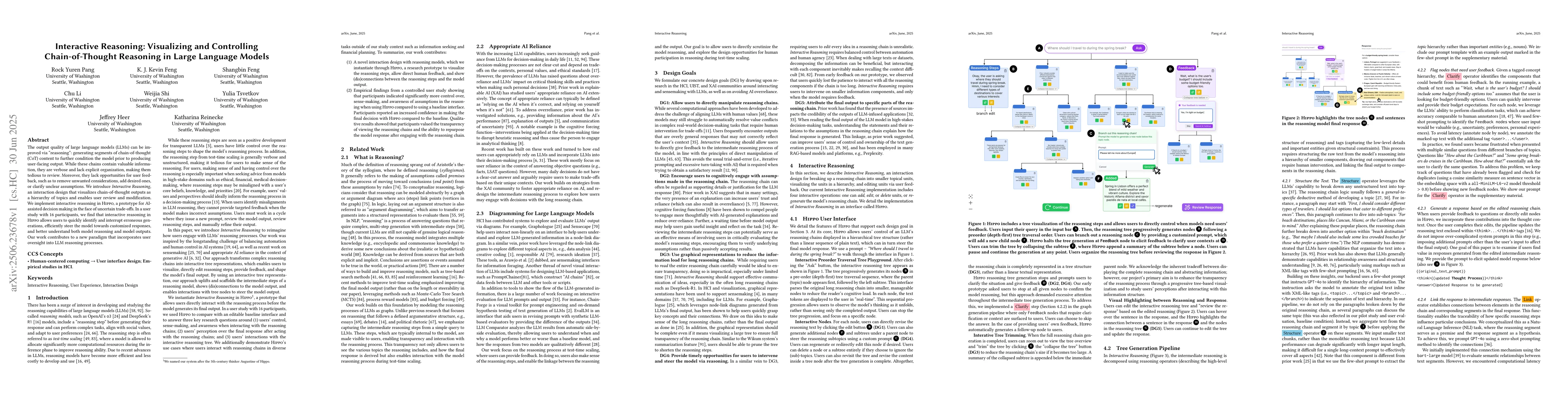 The output quality of large language models (LLMs) can be improved via "reasoning": generating segments of chain-of-thought (CoT) content to further condition the model prior to producing user-facing output. While these chains contain valuable information, they are verbose and lack explicit organization, making them tedious to review. Moreover, they lack opportunities for user feedback, such as to remove unwanted considerations, add desired ones, or clarify unclear assumptions. We introduce Interactive Reasoning, an interaction design that visualizes chain-of-thought outputs as a hierarchy of topics and enables user review and modification. We implement interactive reasoning in Hippo, a prototype for AI-assisted decision making in the face of uncertain trade-offs. In a user study with 16 participants, we find that interactive reasoning in Hippo allows users to quickly identify and interrupt erroneous generations, efficiently steer the model towards customized responses, and better understand both model reasoning and model outputs. Our work contributes to a new paradigm that incorporates user oversight into LLM reasoning processes.