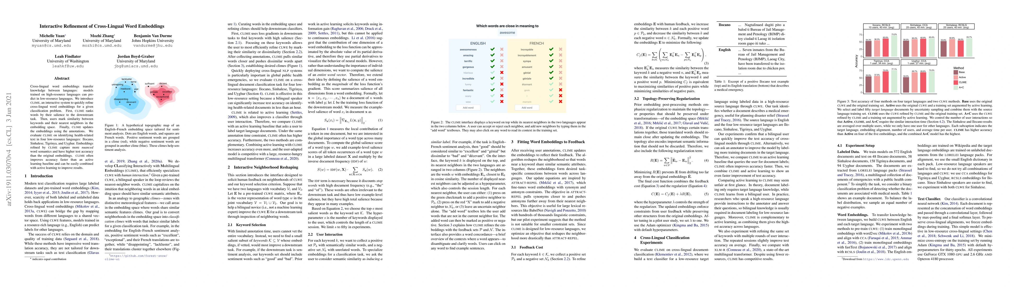 CLIME is an interactive system for refining cross-lingual word embeddings by ranking word salience and incorporating user-annotated word similarities, leading to improved classification accuracy in low-resource languages. It outperforms an active learning baseline and enhances results when combined with it.