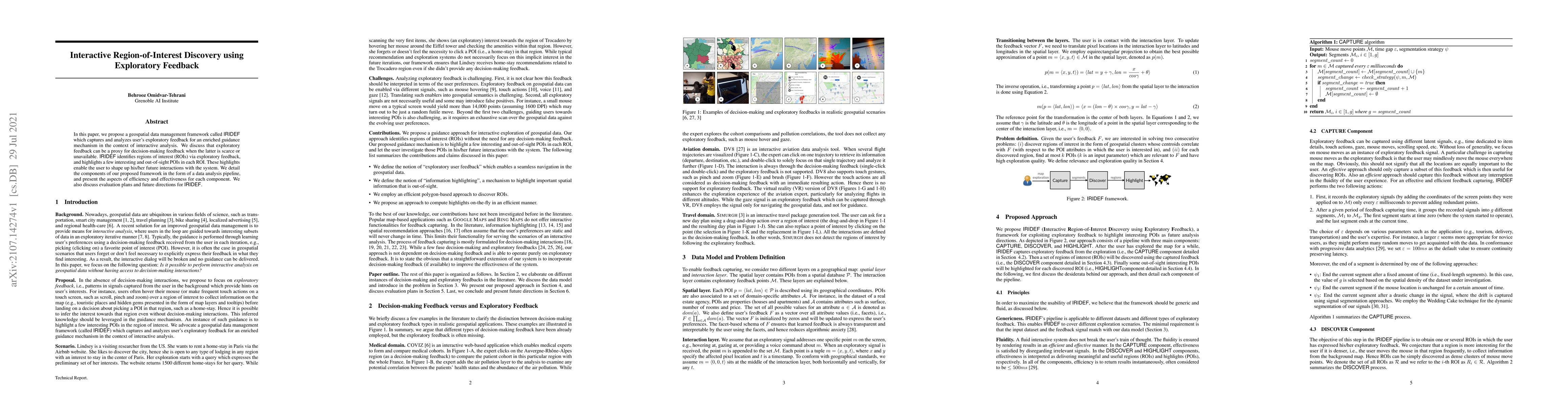 This paper introduces IRIDEF, a geospatial data management framework that leverages users' exploratory feedback to identify regions of interest and highlight significant points of interest, thereby guiding future interactions. The framework aims to compensate for the lack of explicit decision-making feedback and includes a detailed analysis pipeline for efficiency and effectiveness.