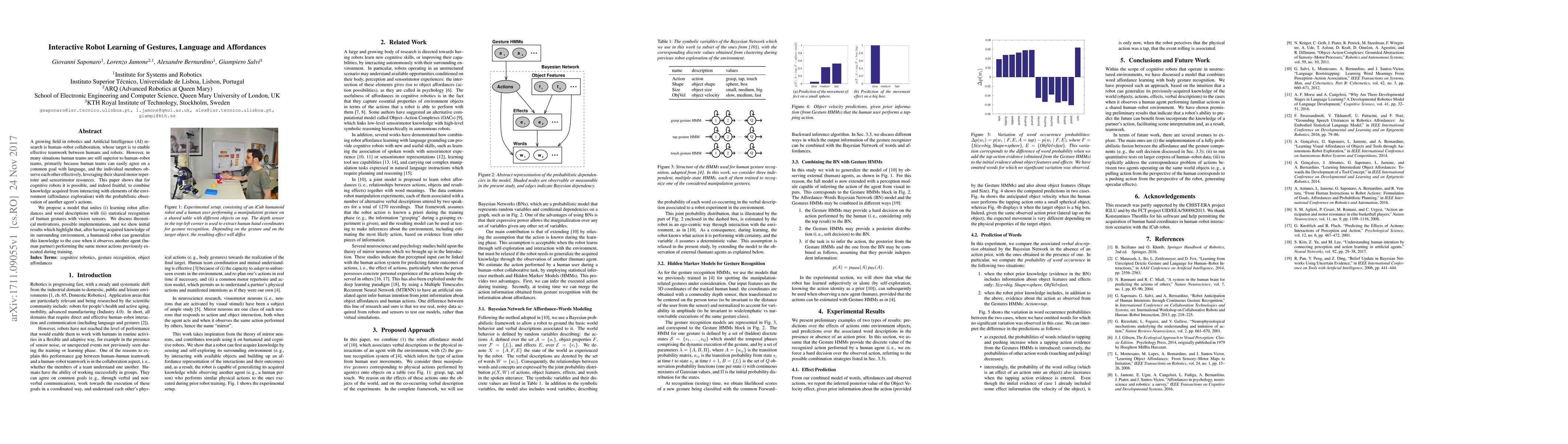 A growing field in robotics and Artificial Intelligence (AI) research is human-robot collaboration, whose target is to enable effective teamwork between humans and robots. However, in many situations human teams are still superior to human-robot teams, primarily because human teams can easily agree on a common goal with language, and the individual members observe each other effectively, leveraging their shared motor repertoire and sensorimotor resources. This paper shows that for cognitive robots it is possible, and indeed fruitful, to combine knowledge acquired from interacting with elements of the environment (affordance exploration) with the probabilistic observation of another agent's actions. We propose a model that unites (i) learning robot affordances and word descriptions with (ii) statistical recognition of human gestures with vision sensors. We discuss theoretical motivations, possible implementations, and we show initial results which highlight that, after having acquired knowledge of its surrounding environment, a humanoid robot can generalize this knowledge to the case when it observes another agent (human partner) performing the same motor actions previously executed during training.