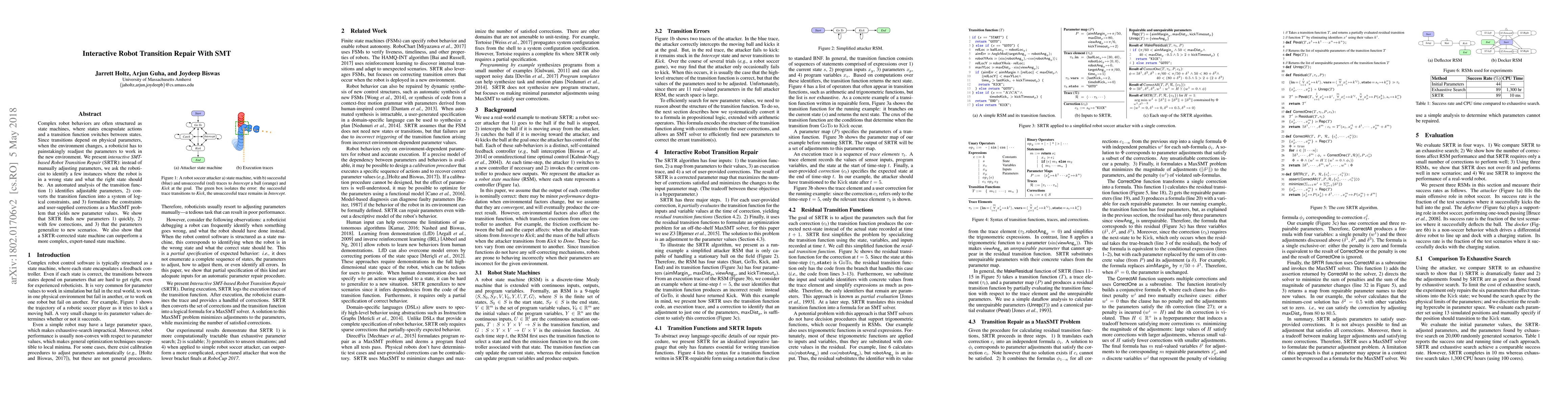 Complex robot behaviors are often structured as state machines, where states encapsulate actions and a transition function switches between states. Since transitions depend on physical parameters, when the environment changes, a roboticist has to painstakingly readjust the parameters to work in the new environment. We present interactive SMT-based Robot Transition Repair (SRTR): instead of manually adjusting parameters, we ask the roboticist to identify a few instances where the robot is in a wrong state and what the right state should be. A lightweight automated analysis of the transition function's source code then 1) identifies adjustable parameters, 2) converts the transition function into a system of logical constraints, and 3) formulates the constraints and user-supplied corrections as MaxSMT problem that yields new parameter values. Our evaluation shows that SRTR is effective on real robots and in simulation. We show that SRTR finds new parameters 1) quickly, 2) with only a few corrections, and 3) that the parameters generalize to new scenarios. We also show that a simple state machine corrected by SRTR can out-perform a more complex, expert-tuned state machine in the real world.