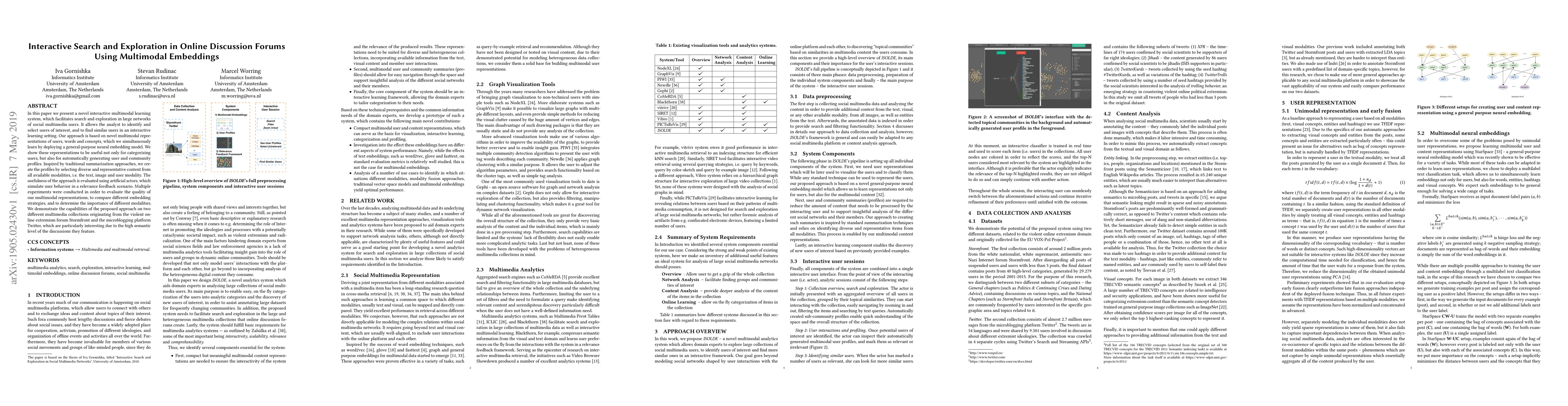 A novel interactive system uses multimodal embeddings to facilitate search and exploration in online discussion forums, identifying users of interest and generating profiles based on diverse content from text, image, and user modality.