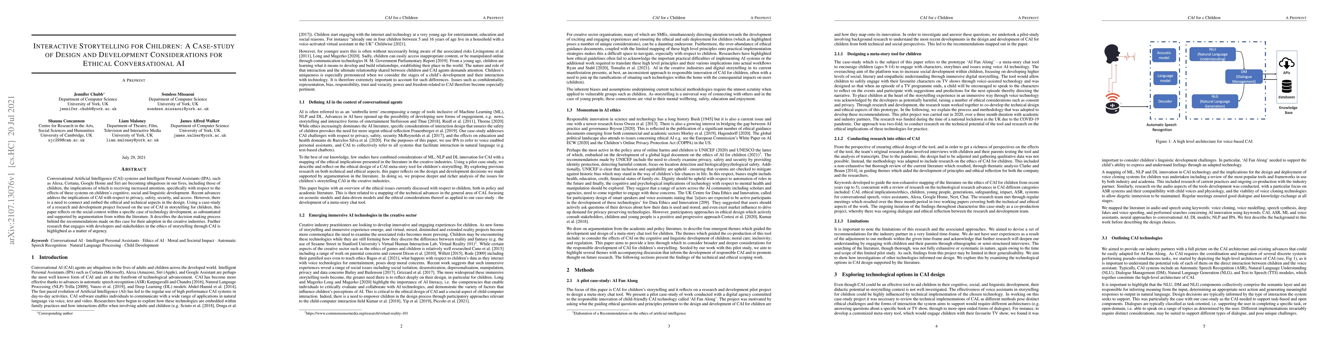 Conversational Artificial Intelligence (CAI) systems and Intelligent Personal Assistants (IPA), such as Alexa, Cortana, Google Home and Siri are becoming ubiquitous in our lives, including those of children, the implications of which is receiving increased attention, specifically with respect to the effects of these systems on children's cognitive, social and linguistic development. Recent advances address the implications of CAI with respect to privacy, safety, security, and access. However, there is a need to connect and embed the ethical and technical aspects in the design. Using a case-study of a research and development project focused on the use of CAI in storytelling for children, this paper reflects on the social context within a specific case of technology development, as substantiated and supported by argumentation from within the literature. It describes the decision making process behind the recommendations made on this case for their adoption in the creative industries. Further research that engages with developers and stakeholders in the ethics of storytelling through CAI is highlighted as a matter of urgency.