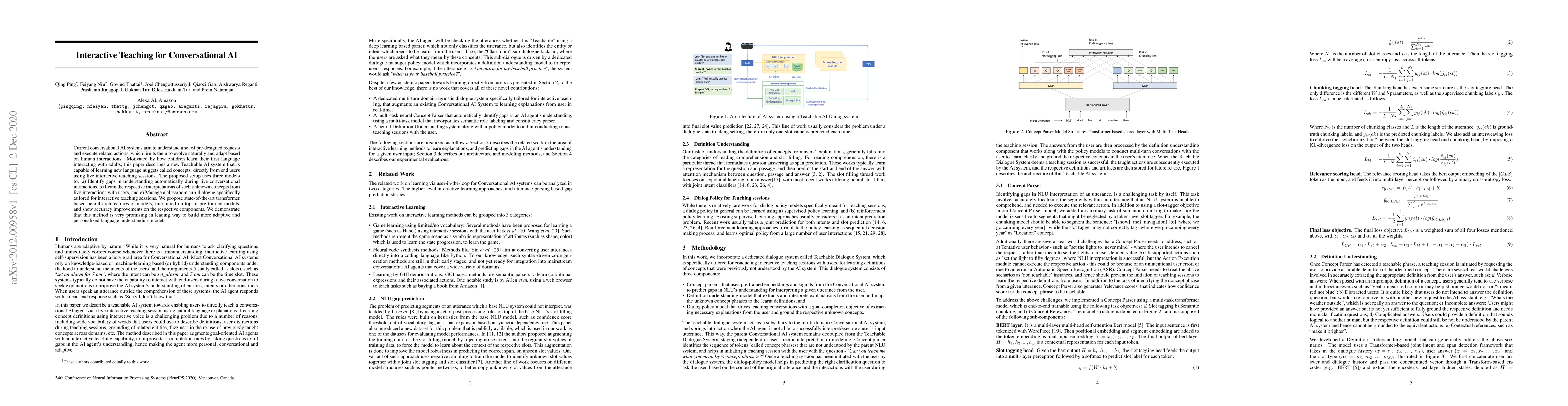 Current conversational AI systems aim to understand a set of pre-designed requests and execute related actions, which limits them to evolve naturally and adapt based on human interactions. Motivated by how children learn their first language interacting with adults, this paper describes a new Teachable AI system that is capable of learning new language nuggets called concepts, directly from end users using live interactive teaching sessions. The proposed setup uses three models to: a) Identify gaps in understanding automatically during live conversational interactions, b) Learn the respective interpretations of such unknown concepts from live interactions with users, and c) Manage a classroom sub-dialogue specifically tailored for interactive teaching sessions. We propose state-of-the-art transformer based neural architectures of models, fine-tuned on top of pre-trained models, and show accuracy improvements on the respective components. We demonstrate that this method is very promising in leading way to build more adaptive and personalized language understanding models.