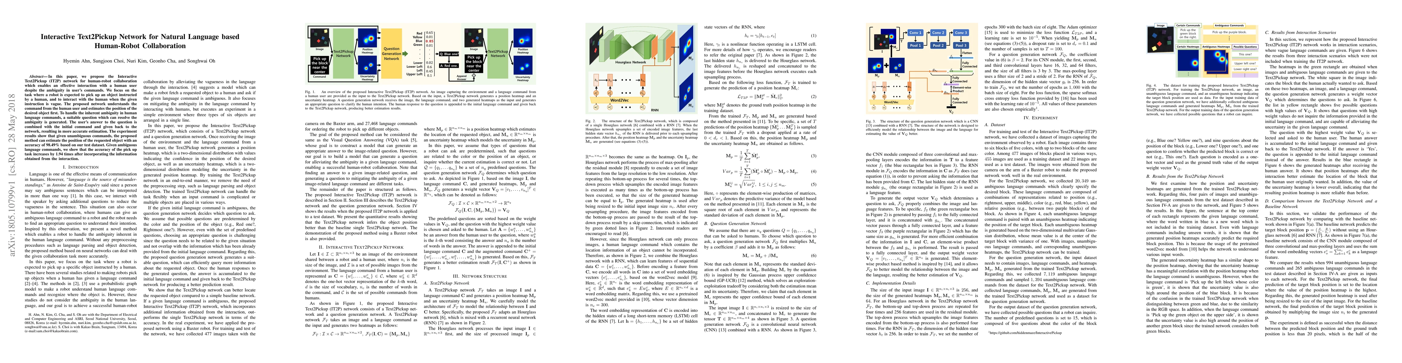 In this paper, we propose the Interactive Text2Pickup (IT2P) network for human-robot collaboration which enables an effective interaction with a human user despite the ambiguity in user's commands. We focus on the task where a robot is expected to pick up an object instructed by a human, and to interact with the human when the given instruction is vague. The proposed network understands the command from the human user and estimates the position of the desired object first. To handle the inherent ambiguity in human language commands, a suitable question which can resolve the ambiguity is generated. The user's answer to the question is combined with the initial command and given back to the network, resulting in more accurate estimation. The experiment results show that given unambiguous commands, the proposed method can estimate the position of the requested object with an accuracy of 98.49% based on our test dataset. Given ambiguous language commands, we show that the accuracy of the pick up task increases by 1.94 times after incorporating the information obtained from the interaction.
