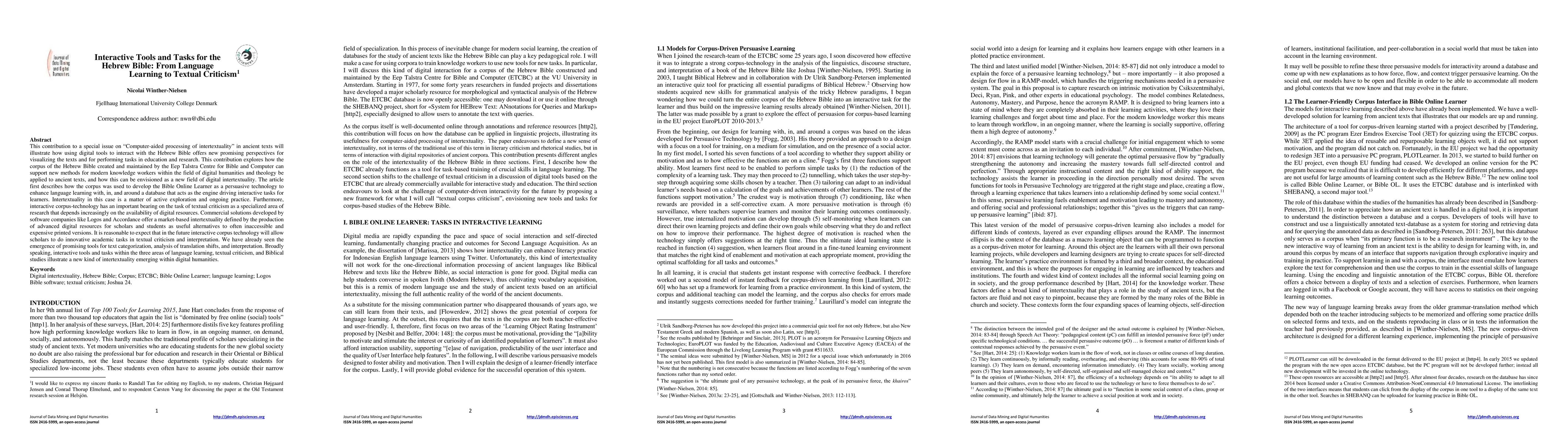 This paper explores how digital tools can enhance learning and research of the Hebrew Bible, using interactive corpus technology to visualize texts and perform tasks in education and research.