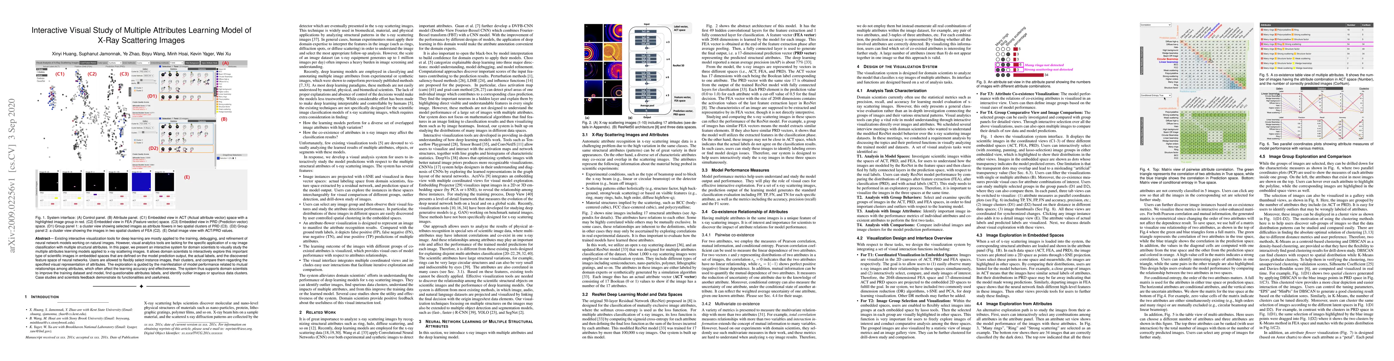 Existing interactive visualization tools for deep learning are mostly applied to the training, debugging, and refinement of neural network models working on natural images. However, visual analytics tools are lacking for the specific application of x-ray image classification with multiple structural attributes. In this paper, we present an interactive system for domain scientists to visually study the multiple attributes learning models applied to x-ray scattering images. It allows domain scientists to interactively explore this important type of scientific images in embedded spaces that are defined on the model prediction output, the actual labels, and the discovered feature space of neural networks. Users are allowed to flexibly select instance images, their clusters, and compare them regarding the specified visual representation of attributes. The exploration is guided by the manifestation of model performance related to mutual relationships among attributes, which often affect the learning accuracy and effectiveness. The system thus supports domain scientists to improve the training dataset and model, find questionable attributes labels, and identify outlier images or spurious data clusters. Case studies and scientists feedback demonstrate its functionalities and usefulness.