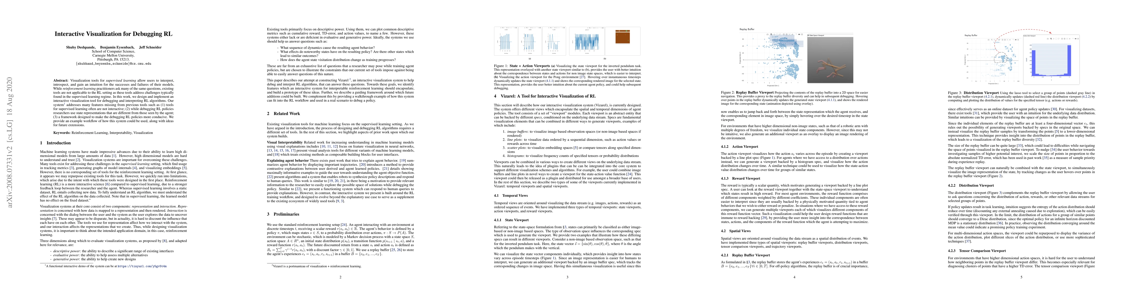 This paper introduces an interactive visualization tool designed to aid in debugging and interpreting reinforcement learning (RL) algorithms, addressing limitations of existing supervised learning tools. The system offers features tailored to the RL domain, including interactivity, state representation alignment, and a conducive framework for debugging RL policies.