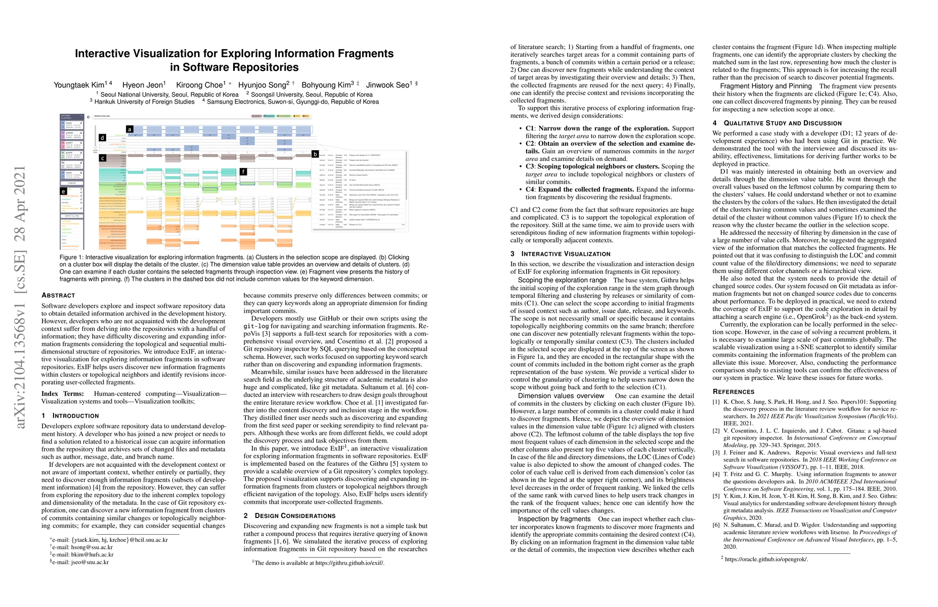 Title: Interactive Visualization for Exploring Information Fragments in Software Repositories Summary: ExIF is an interactive visualization tool designed to help developers explore software repositories by discovering new information fragments within clusters and identifying revisions that incorporate user-collected fragments, addressing the challenge of navigating complex repository structures.