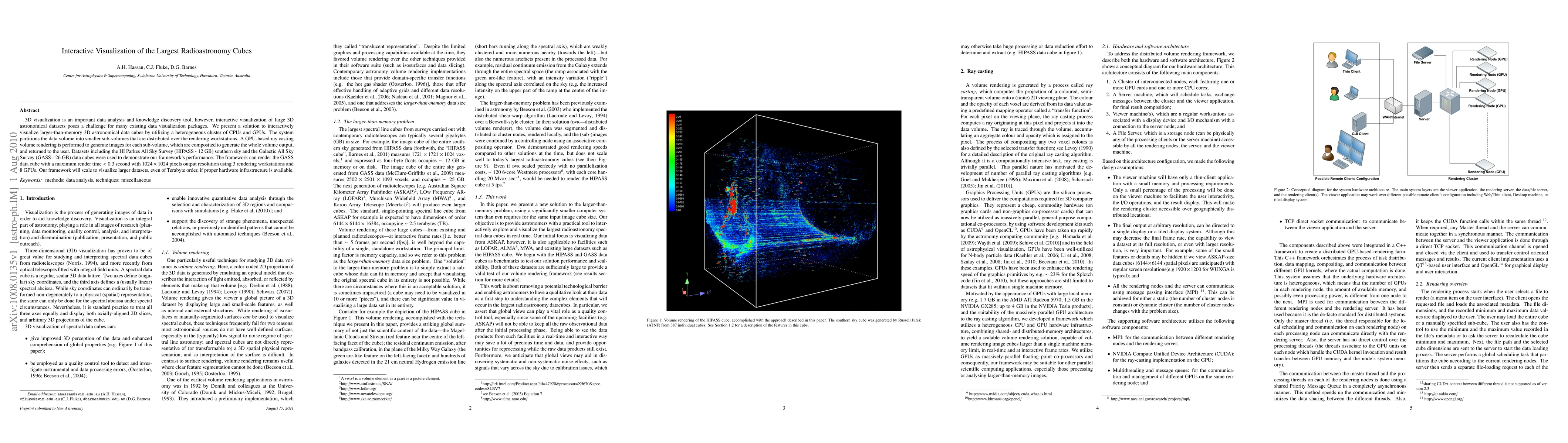 This paper presents a framework for interactively visualizing large 3D astronomical data cubes using a heterogeneous cluster of CPUs and GPUs, enabling efficient rendering of datasets like HIPASS and GASS. The system partitions data and utilizes GPU-based ray casting to generate composite images, achieving sub-second render times for large data cubes.