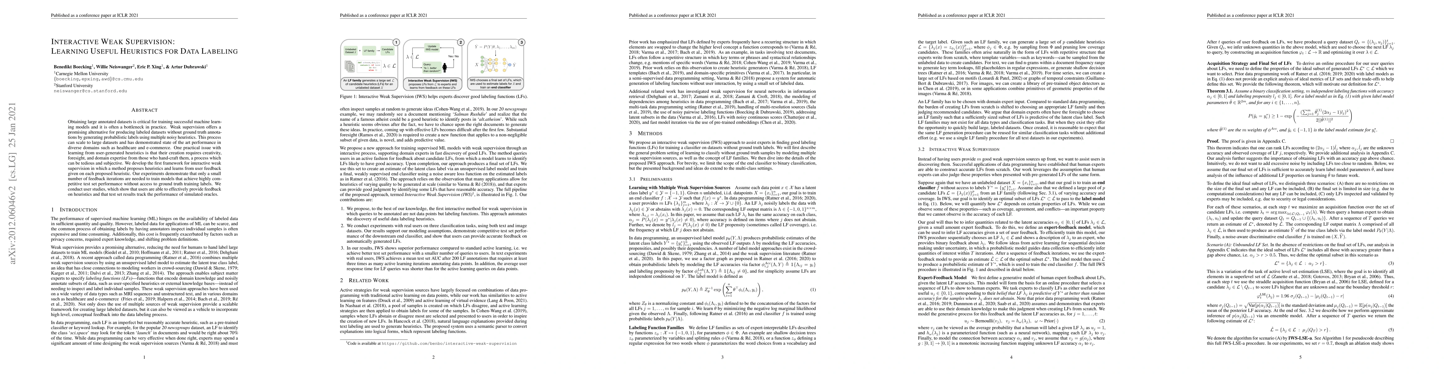 Obtaining large annotated datasets is critical for training successful machine learning models and it is often a bottleneck in practice. Weak supervision offers a promising alternative for producing labeled datasets without ground truth annotations by generating probabilistic labels using multiple noisy heuristics. This process can scale to large datasets and has demonstrated state of the art performance in diverse domains such as healthcare and e-commerce. One practical issue with learning from user-generated heuristics is that their creation requires creativity, foresight, and domain expertise from those who hand-craft them, a process which can be tedious and subjective. We develop the first framework for interactive weak supervision in which a method proposes heuristics and learns from user feedback given on each proposed heuristic. Our experiments demonstrate that only a small number of feedback iterations are needed to train models that achieve highly competitive test set performance without access to ground truth training labels. We conduct user studies, which show that users are able to effectively provide feedback on heuristics and that test set results track the performance of simulated oracles.
