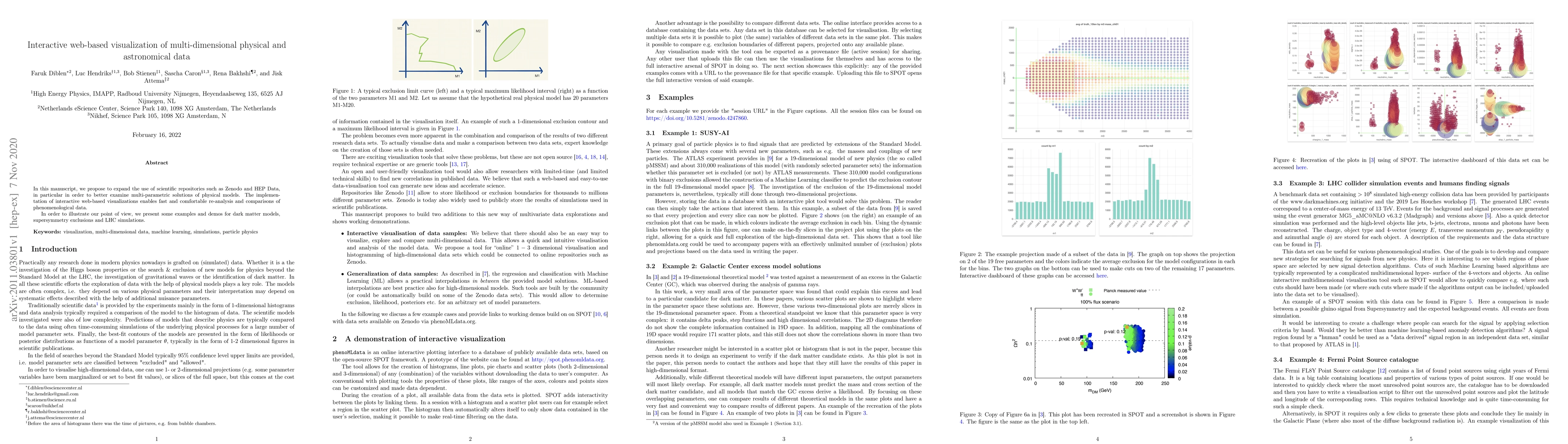 This paper proposes enhancing scientific repositories with interactive web-based visualizations for multi-dimensional physical and astronomical data, facilitating re-analysis and comparisons of phenomenological data. Examples include dark matter models, supersymmetry exclusions, and LHC simulations.