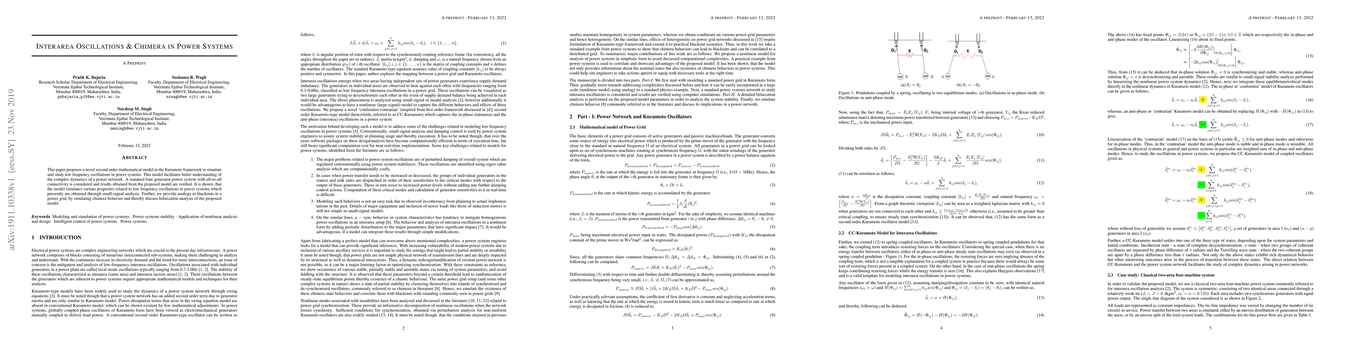 This paper proposes a novel second order mathematical model in the Kuramoto framework to simulate and study low frequency oscillations in power systems. This model facilitates better understanding of the complex dynamics of a power network. A standard four generator power system with all-to-all connectivity is considered and results obtained from the proposed model are verified. It is shown, that the model simulates various properties related to low frequency oscillations in power systems which presently are obtained through small-signal analysis. Further, we provide analogy to blackouts in a power grid, by emulating chimera behavior and thereby discuss bifurcation analysis of the proposed model.