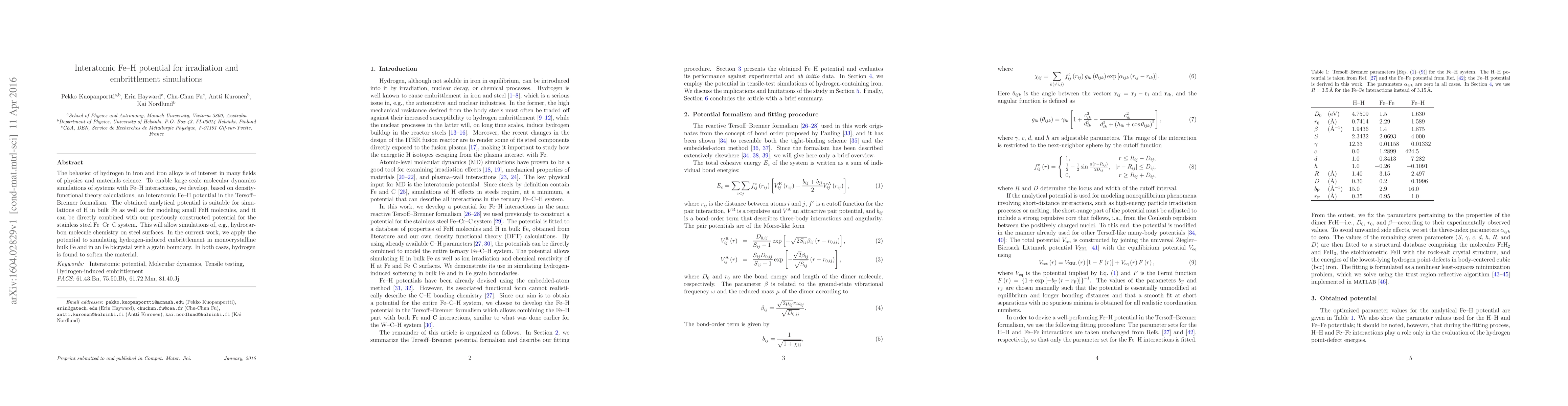 The behavior of hydrogen in iron and iron alloys is of interest in many fields of physics and materials science. To enable large-scale molecular dynamics simulations of systems with Fe-H interactions, we develop, based on density-functional theory calculations, an interatomic Fe-H potential in the Tersoff-Brenner formalism. The obtained analytical potential is suitable for simulations of H in bulk Fe as well as for modeling small FeH molecules, and it can be directly combined with our previously constructed potential for the stainless steel Fe-Cr-C system. This will allow simulations of, e.g., hydrocarbon molecule chemistry on steel surfaces. In the current work, we apply the potential to simulating hydrogen-induced embrittlement in monocrystalline bulk Fe and in an Fe bicrystal with a grain boundary. In both cases, hydrogen is found to soften the material.