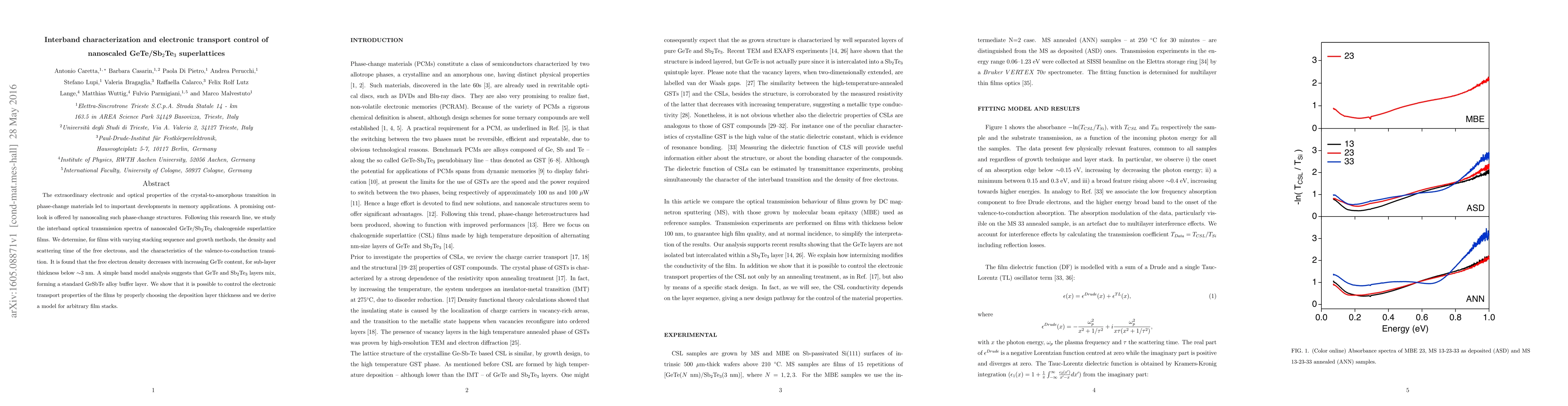 This paper investigates the interband optical transmission and electronic transport properties of nanoscaled GeTe/Sb$_2$Te$_3$ superlattice films, finding that free electron density decreases with increasing GeTe content for sub-3 nm layers, and proposes a model to control electronic transport by selecting appropriate layer thicknesses.